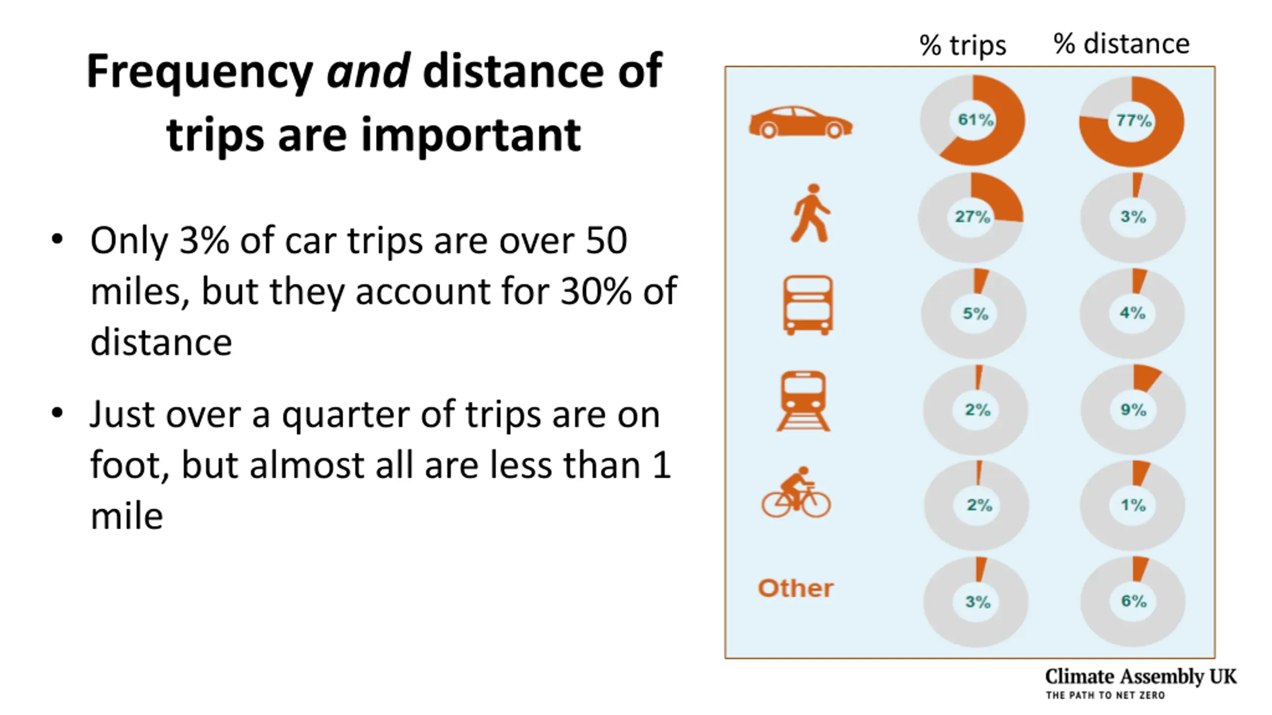 % distance % trips Frequency and distance of trips are important Only 3% of car trips are over 50 miles, but they account for 30% of distance Just over a quarter of trips are on foot, but almost all are less than 1 mile