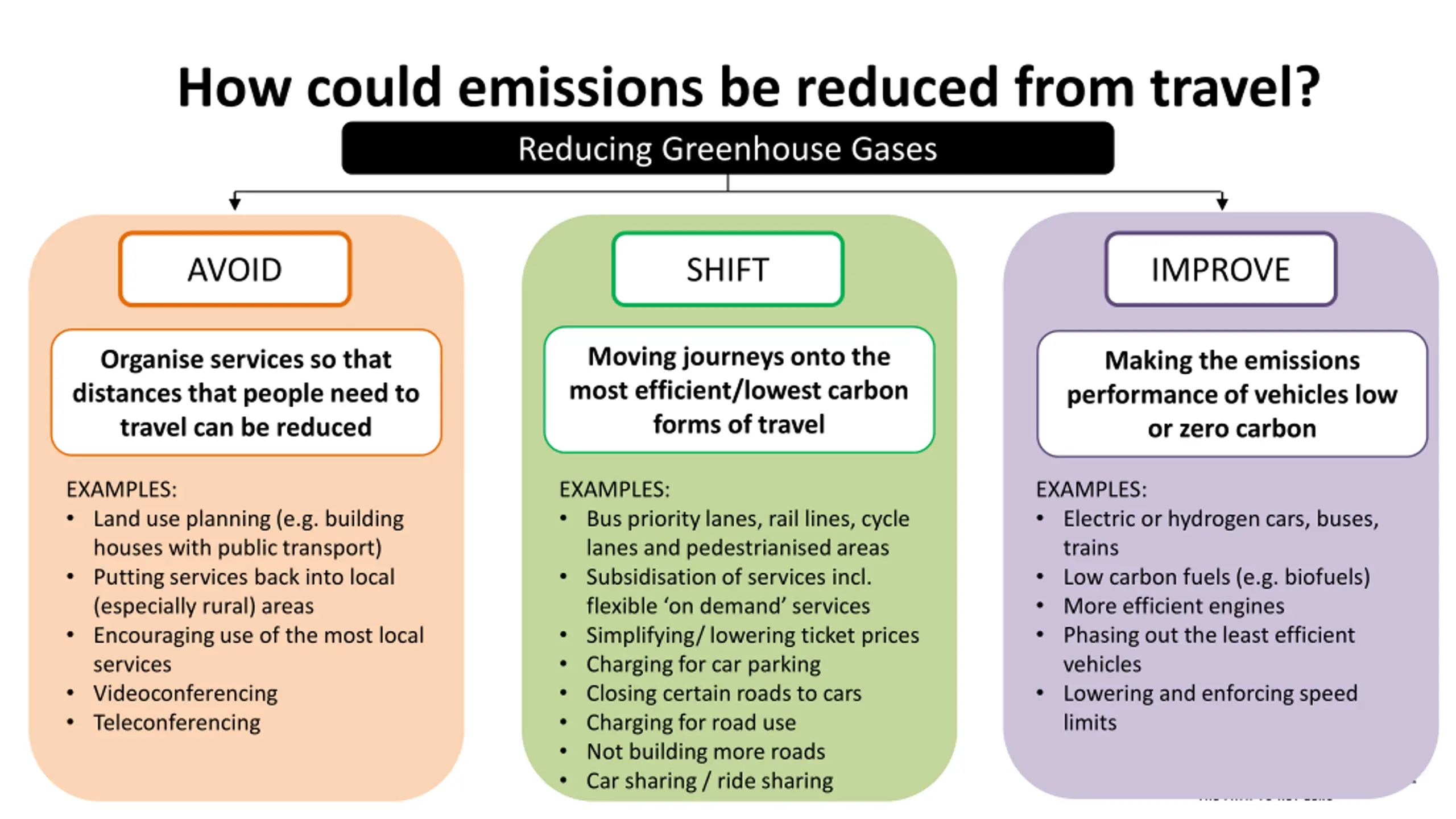 How could emissions be reduced from travel? Reducing Greenhouse Gases AVOID SHIFT IMPROVE Moving journeys onto the most efficient/lowest carbon forms of travel Organise services so that distances that people need to travel can be reduced Making the emissions performance of vehicles low or zero carbon EXAMPLES: Land use planning (e.g. building houses with public transport) Putting services back into local (especially rural) areas Encouraging use of the most local services Videoconferencing Teleconferencing EXAMPLES: Bus priority lanes, rail lines, cycle lanes and pedestrianised areas Subsidisation of services incl. flexible on demand services Simplifying/ lowering ticket prices Charging for car parking Closing certain roads to cars Charging for road use Not building more roads Car sharing / ride sharing EXAMPLES: Electric or hydrogen cars, buses, trains Low carbon fuels (e.g. biofuels) More efficient engines Phasing out the least efficient vehicles Lowering and enforcing speed limits