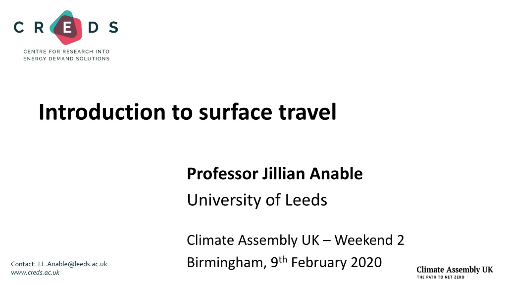 Introduction to surface travel Professor Jillian Anable University of Leeds Climate Assembly UK Weekend 2 Birmingham, 9thFebruary 2020 Contact: J.L.Anable@leeds.ac.uk www.creds.ac.uk