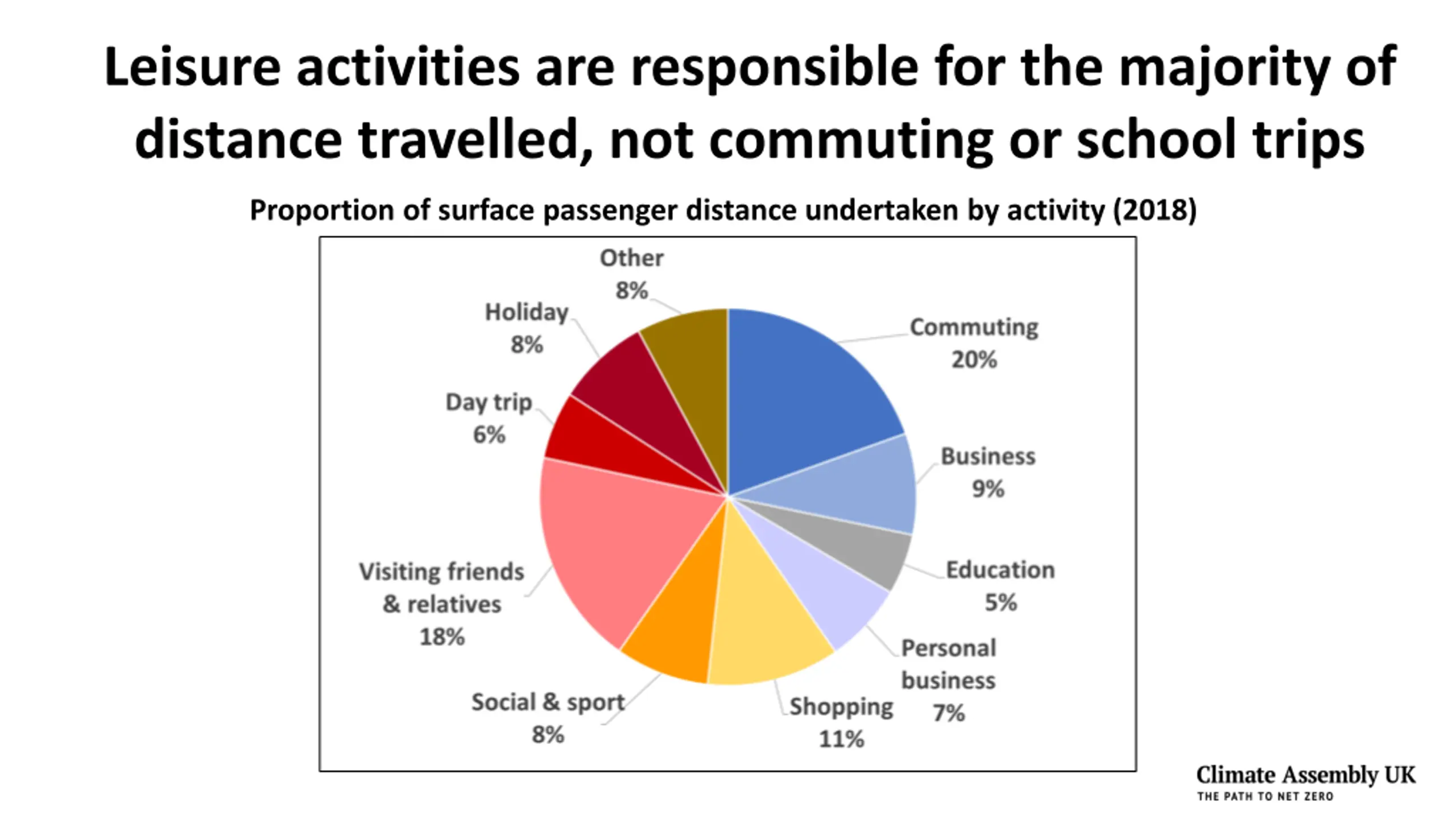Leisure activities are responsible for the majority of distance travelled, not commuting or school trips Proportion of surface passenger distance undertaken by activity (2018)