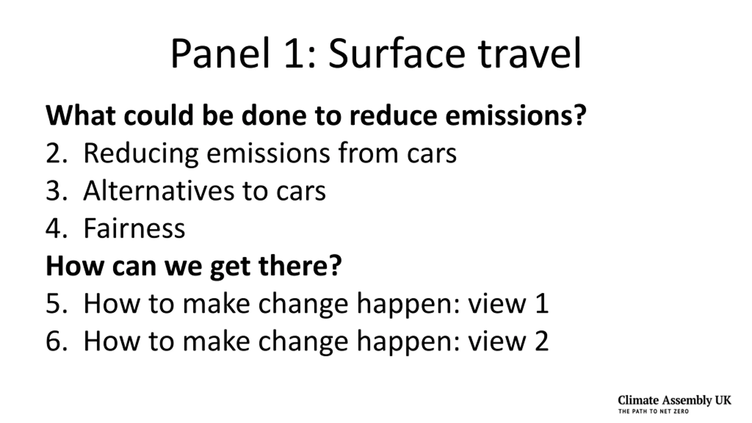 Panel 1: Surface travel What could be done to reduce emissions? 2. Reducing emissions from cars 3. Alternatives to cars 4. Fairness How can we get there? 5. How to make change happen: view 1 6. How to make change happen: view 2