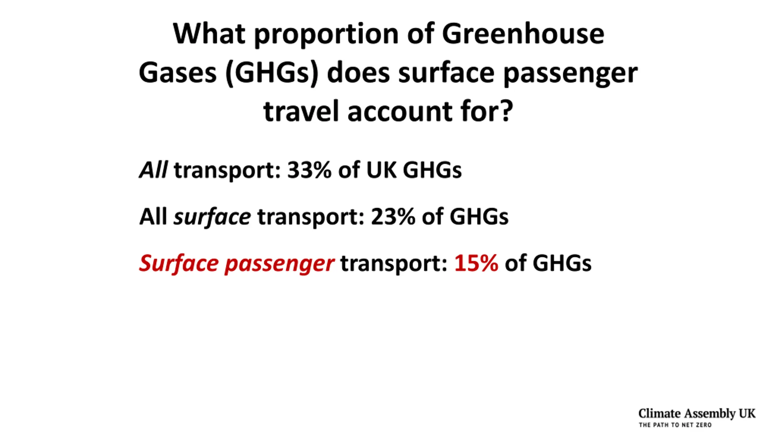 What proportion of Greenhouse Gases (GHGs) does surface passenger travel account for? All transport: 33% of UK GHGs All surface transport: 23% of GHGs Surfacepassenger transport: 15% of GHGs