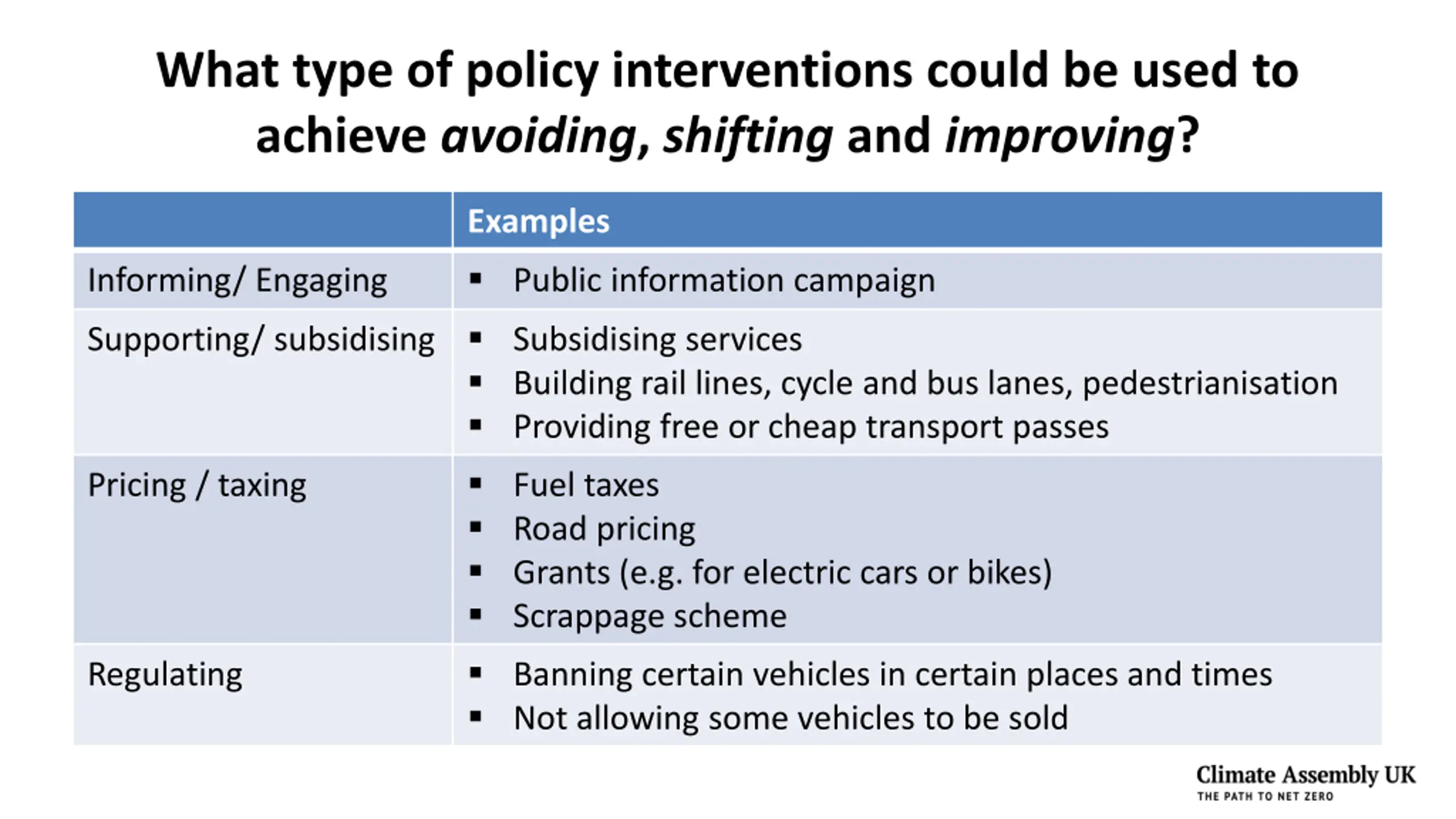 What type of policy interventions could be used to achieve avoiding, shifting and improving? Examples Public information campaign Informing/ Engaging Supporting/ subsidising Subsidising services Building rail lines, cycle and bus lanes, pedestrianisation Providing free or cheap transport passes Fuel taxes Road pricing Grants (e.g. for electric cars or bikes) Scrappage scheme Banning certain vehicles in certain places and times Not allowing some vehicles to be sold Pricing / taxing Regulating