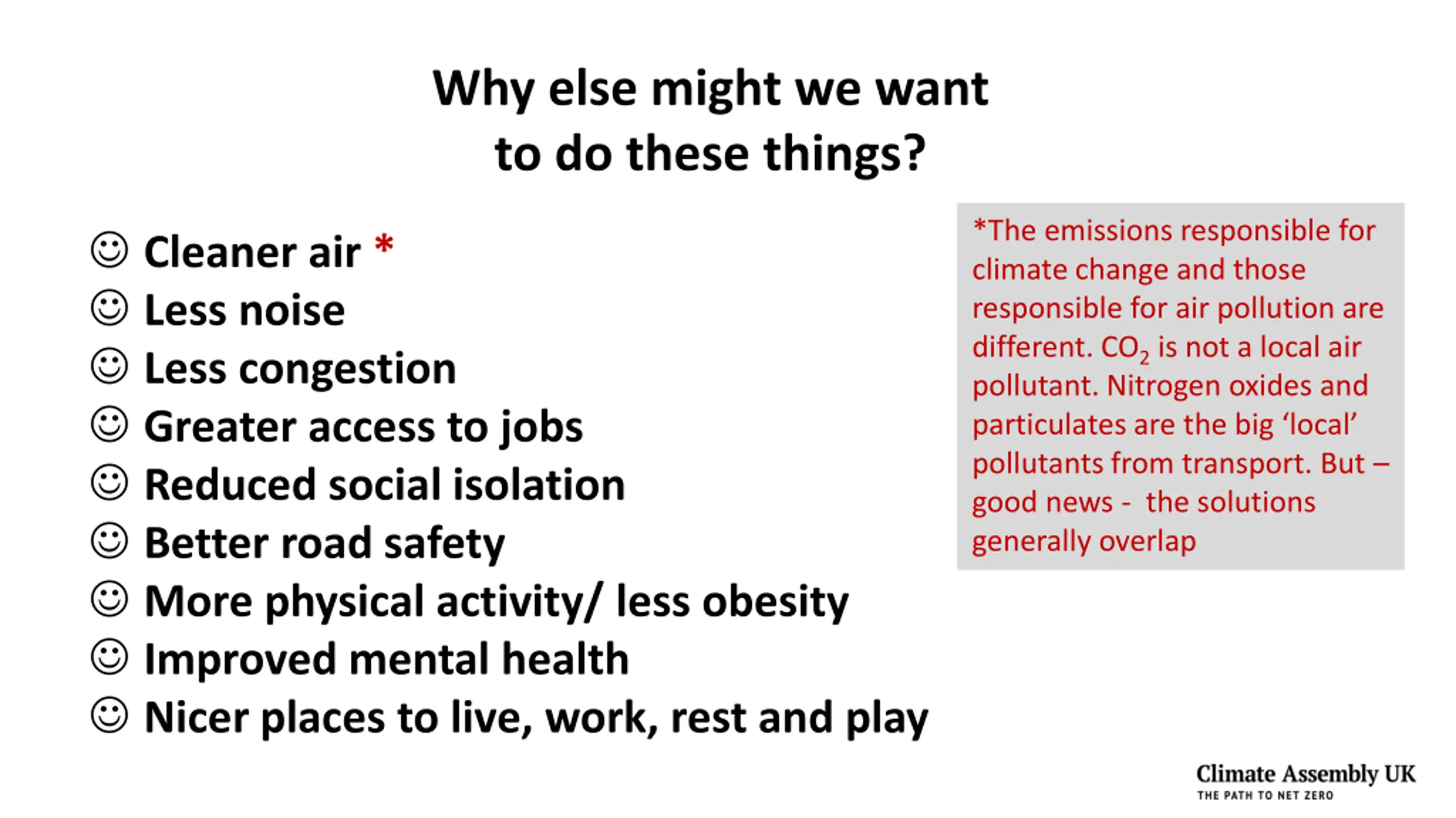 Why else might we want to do these things? *The emissions responsible for climate change and those responsible for air pollution are different. CO2 is not a local air pollutant. Nitrogen oxides and particulates are the big local pollutants from transport. But good news - the solutions generally overlap Cleaner air * Less noise Less congestion Greater access to jobs Reduced social isolation Better road safety More physical activity/ less obesity Improved mental health Nicer places to live, work, rest and play