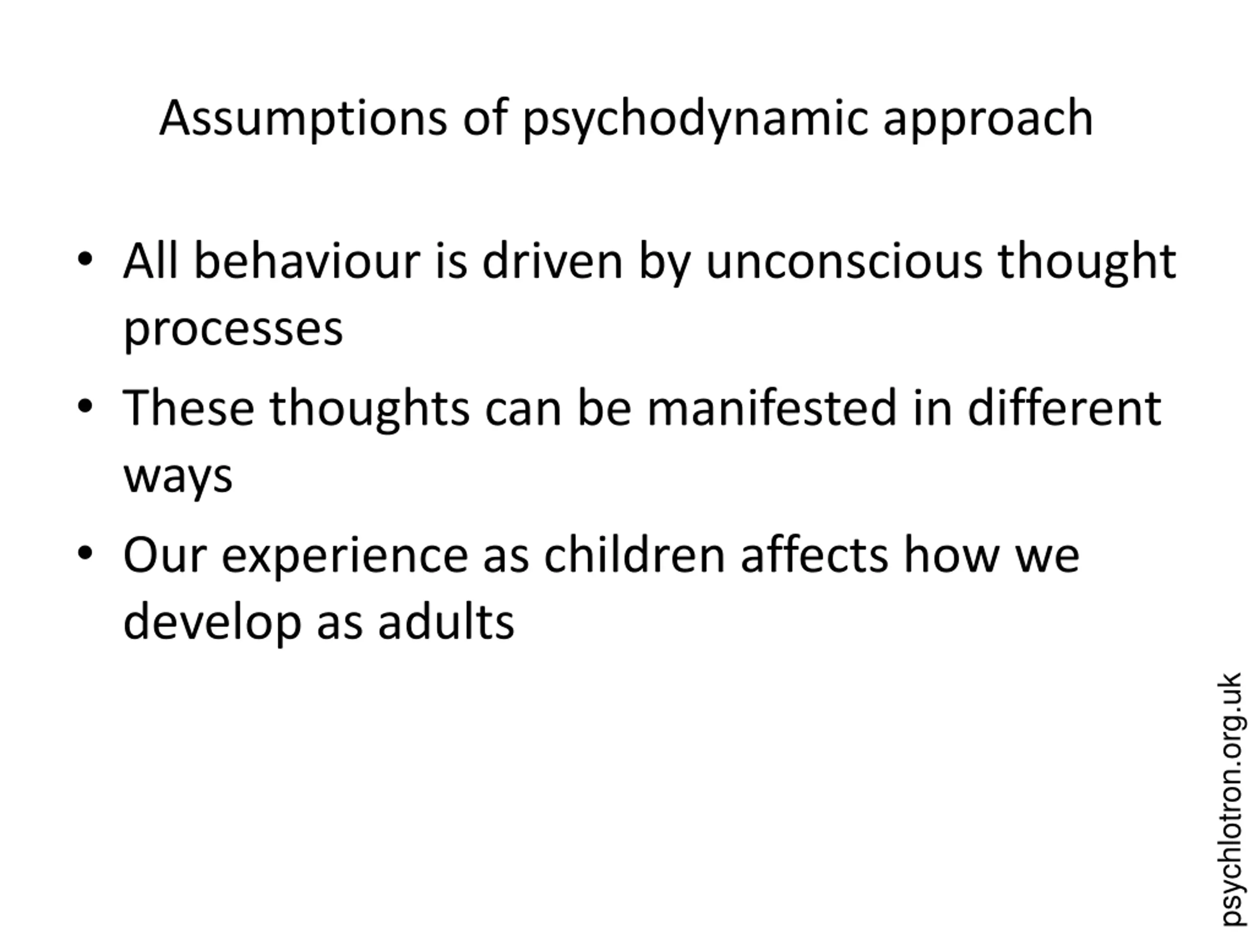 Assumptions of psychodynamic approach All behaviour is driven by unconscious thought processes These thoughts can be manifested in different ways Our experience as children affects how we develop as adults psychlotron.org.uk