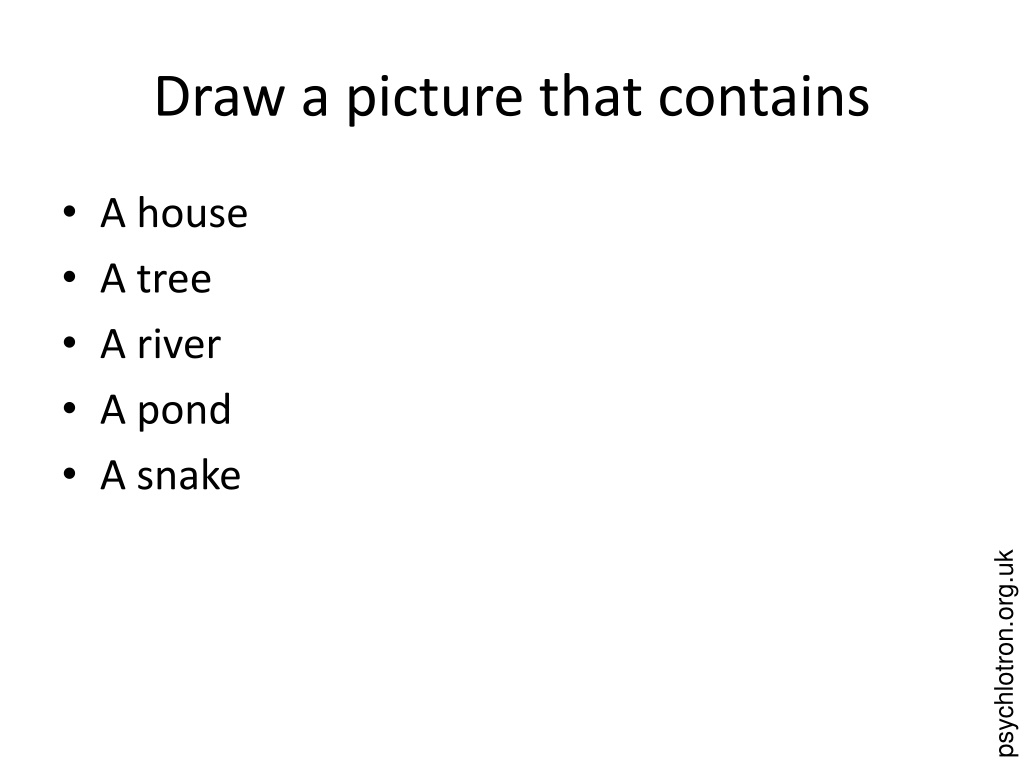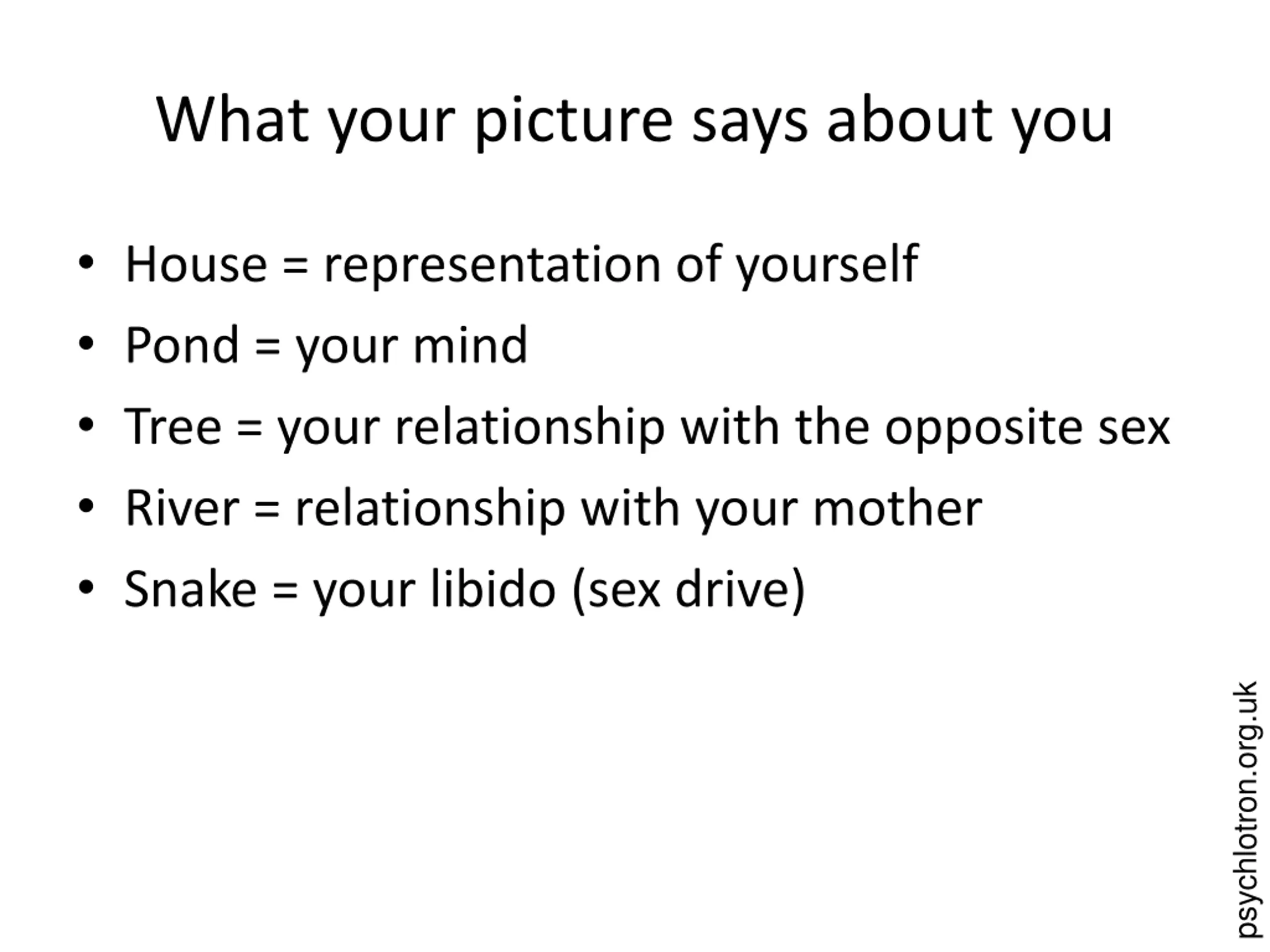 What your picture says about you House = representation of yourself Pond = your mind Tree = your relationship with the opposite sex River = relationship with your mother Snake = your libido (sex drive) psychlotron.org.uk