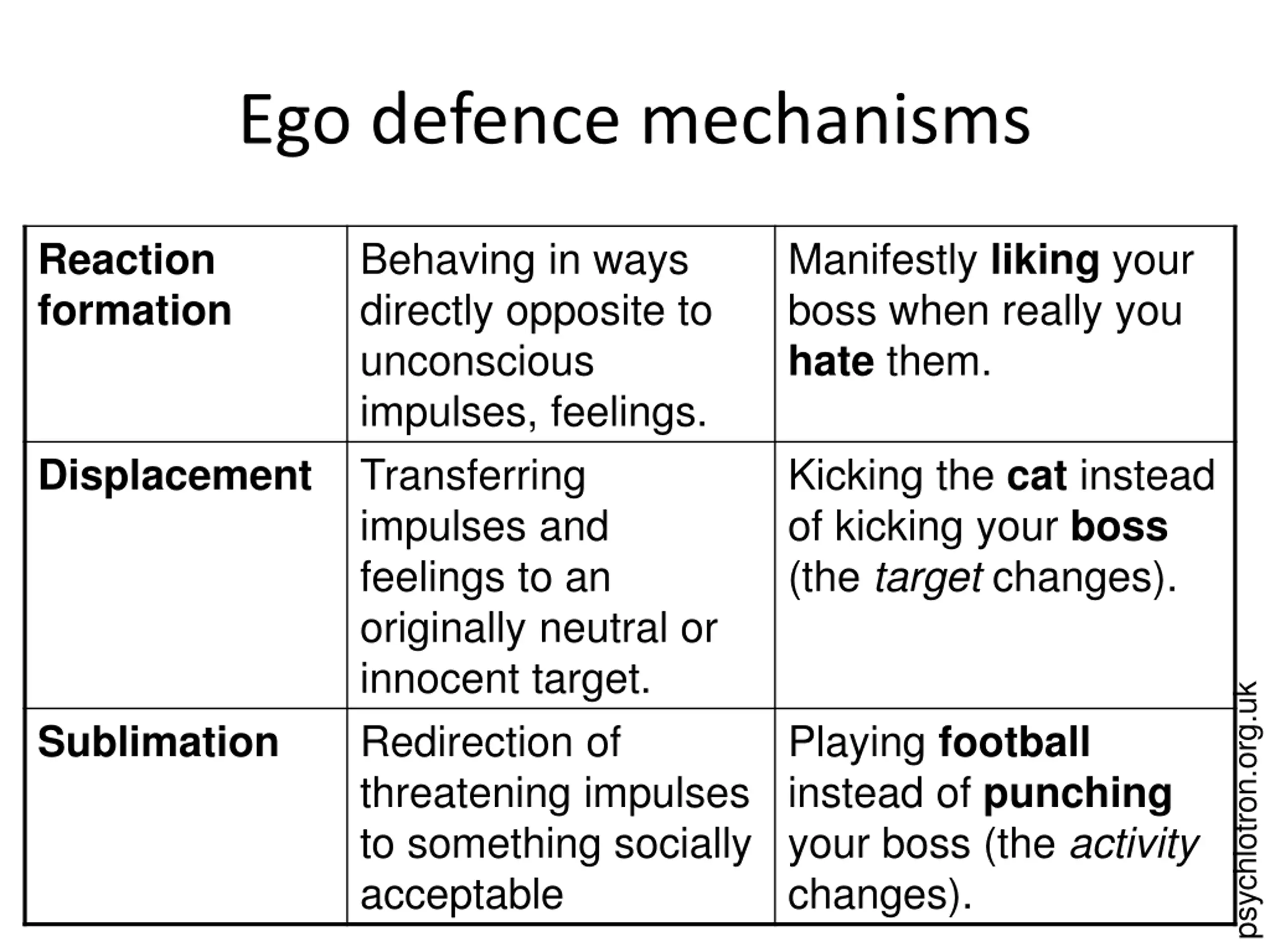 Ego defence mechanisms Behaving in ways directly opposite to unconscious impulses, feelings. Transferring impulses and feelings to an originally neutral or innocent target. Redirection of threatening impulses to something socially acceptable Manifestly liking your boss when really you hate them. Reaction formation Kicking the cat instead of kicking your boss (the target changes). Displacement psychlotron.org.uk Playing football instead of punching your boss (the activity changes). Sublimation