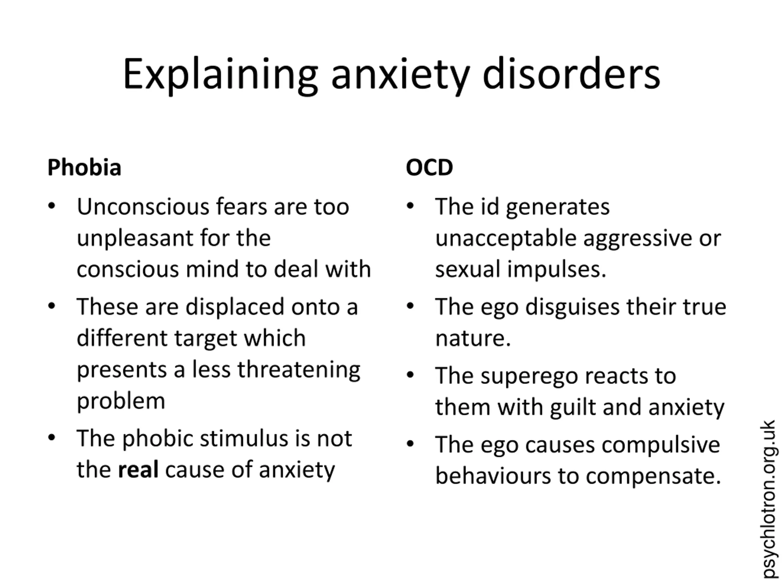 Explaining anxiety disorders Phobia Unconscious fears are too unpleasant for the conscious mind to deal with These are displaced onto a different target which presents a less threatening problem The phobic stimulus is not the real cause of anxiety OCD The id generates unacceptable aggressive or sexual impulses. The ego disguises their true nature. The superego reacts to them with guilt and anxiety The ego causes compulsive behaviours to compensate. psychlotron.org.uk