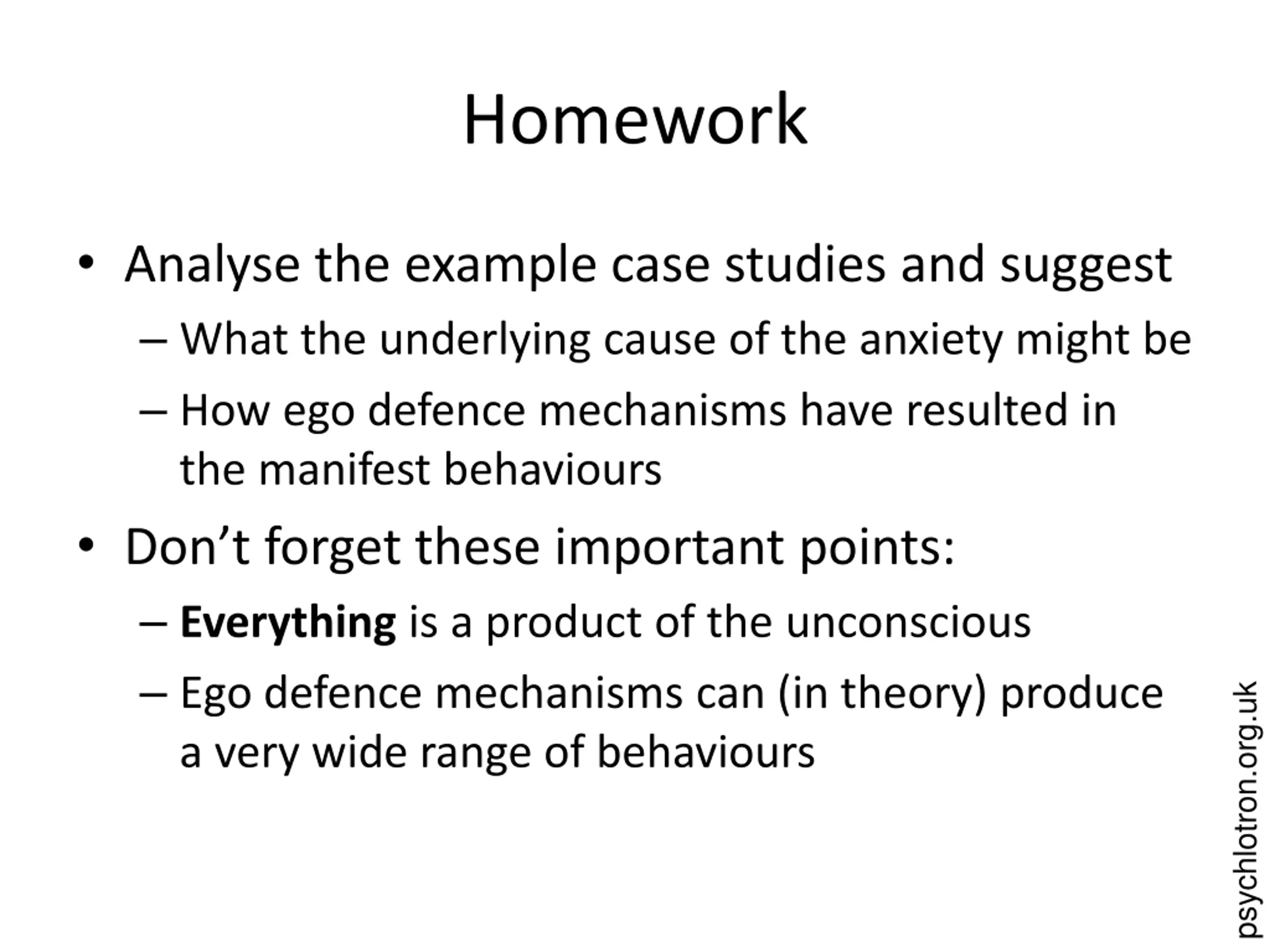 Homework Analyse the example case studies and suggest What the underlying cause of the anxiety might be How ego defence mechanisms have resulted in the manifest behaviours Don t forget these important points: Everything is a product of the unconscious Ego defence mechanisms can (in theory) produce a very wide range of behaviours psychlotron.org.uk