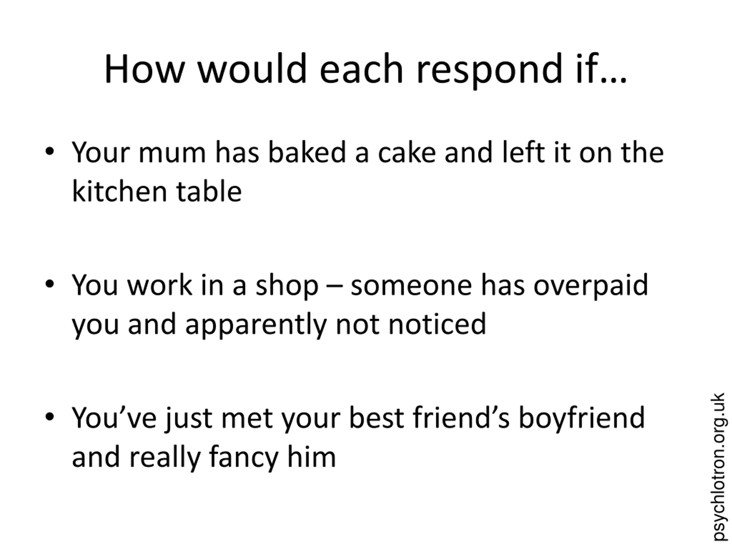 How would each respond if Your mum has baked a cake and left it on the kitchen table You work in a shop someone has overpaid you and apparently not noticed psychlotron.org.uk You ve just met your best friend s boyfriend and really fancy him