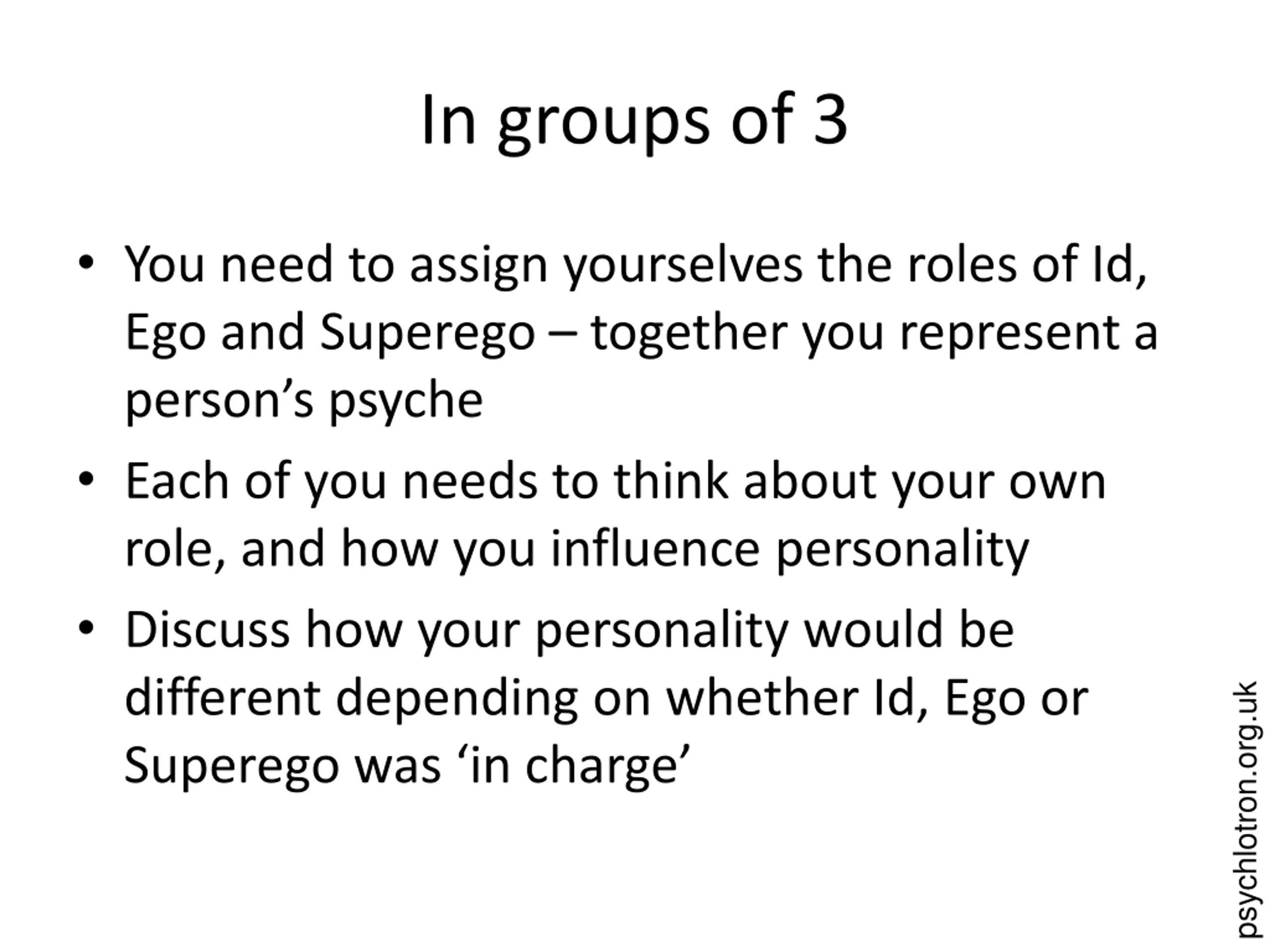 In groups of 3 You need to assign yourselves the roles of Id, Ego and Superego together you represent a person s psyche Each of you needs to think about your own role, and how you influence personality Discuss how your personality would be different depending on whether Id, Ego or Superego was in charge psychlotron.org.uk