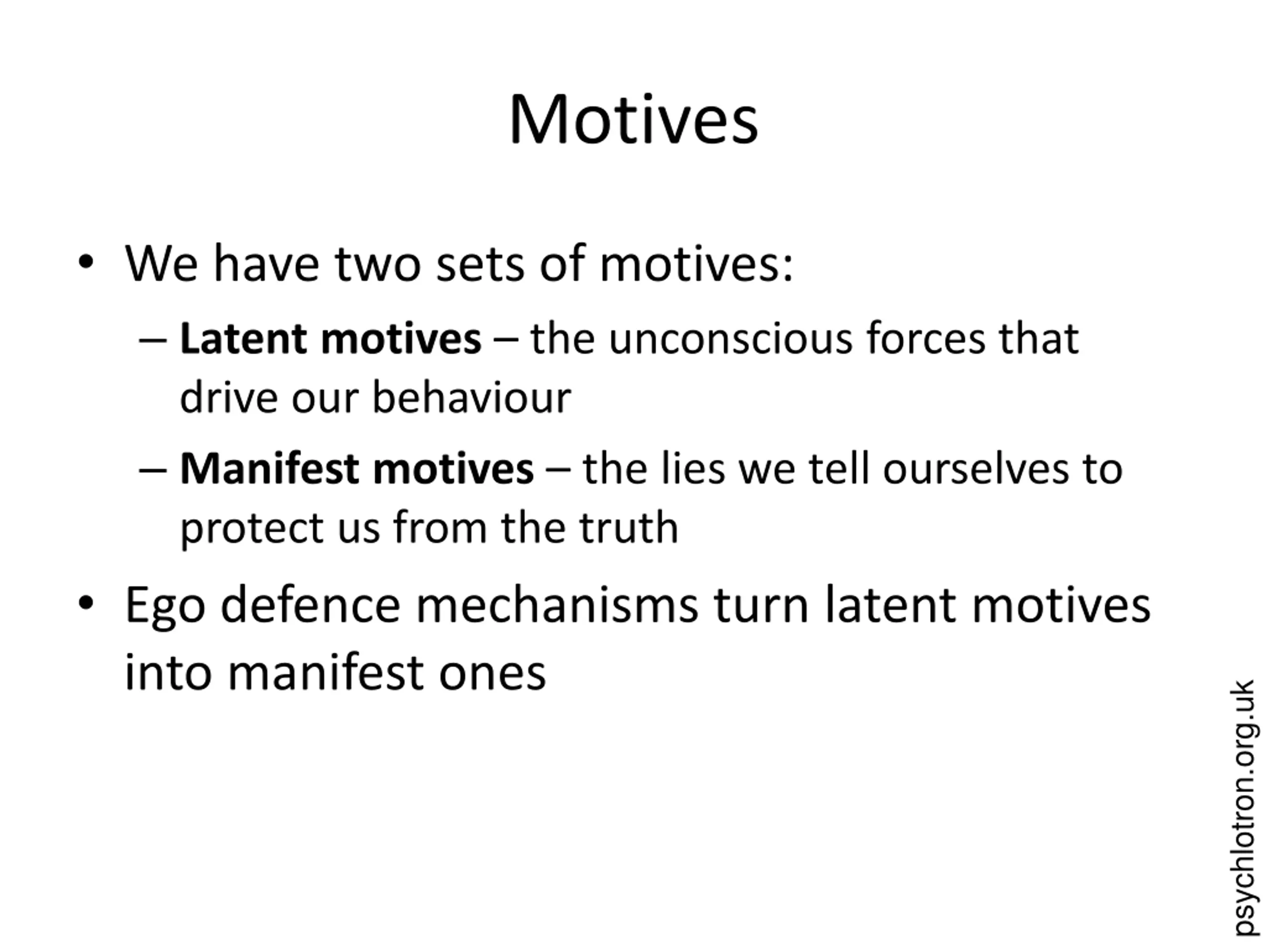 Motives We have two sets of motives: Latent motives the unconscious forces that drive our behaviour Manifest motives the lies we tell ourselves to protect us from the truth Ego defence mechanisms turn latent motives into manifest ones psychlotron.org.uk