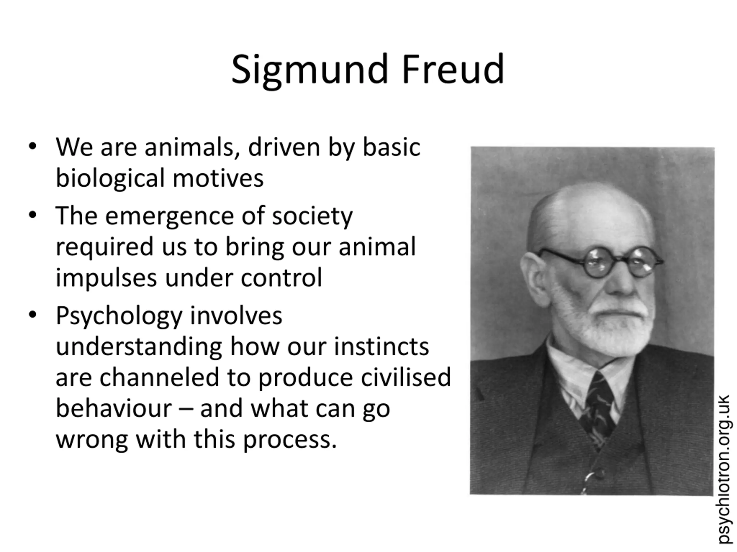 Sigmund Freud We are animals, driven by basic biological motives The emergence of society required us to bring our animal impulses under control Psychology involves understanding how our instincts are channeled to produce civilised behaviour and what can go wrong with this process. psychlotron.org.uk