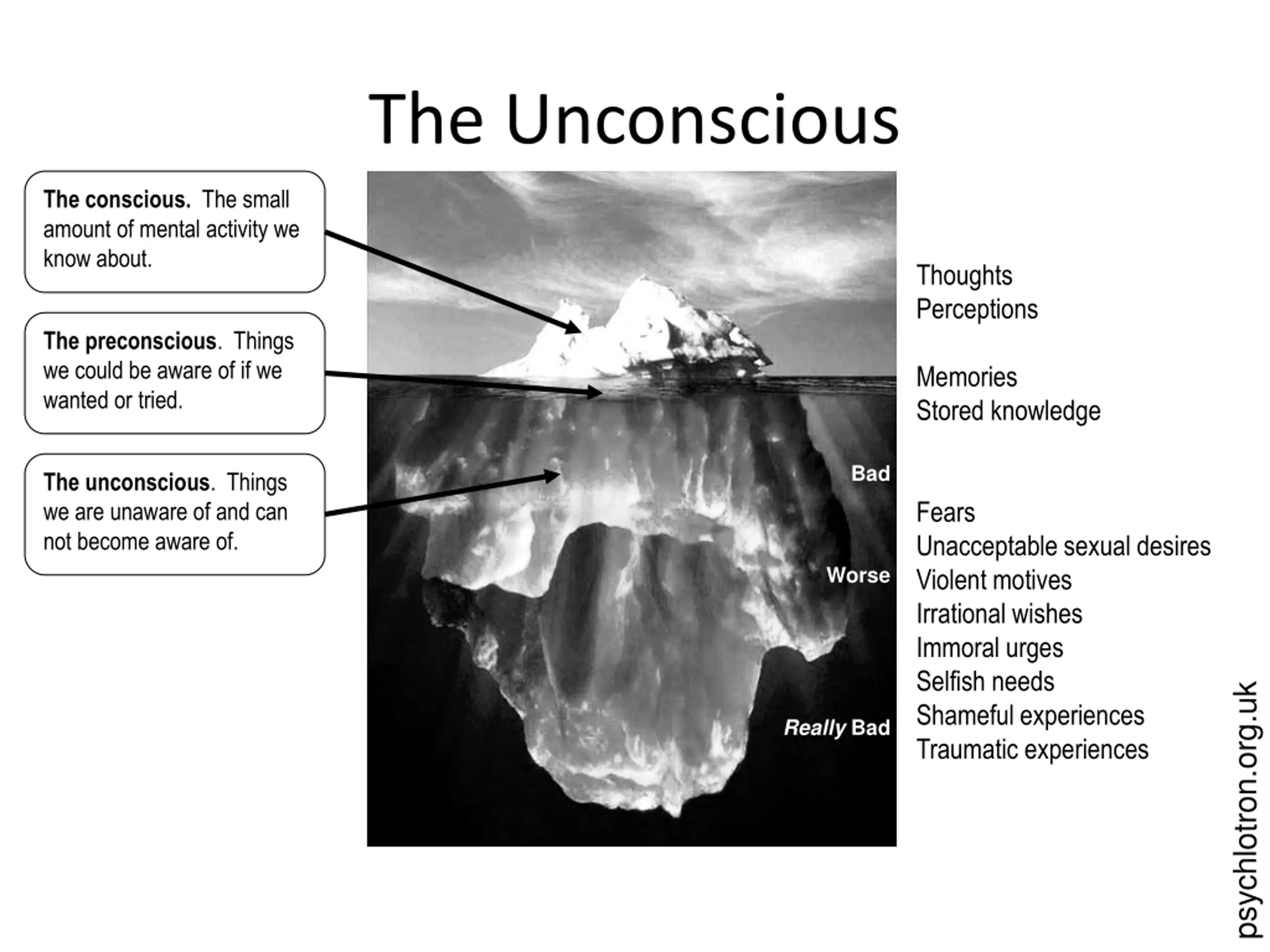 The Unconscious The conscious. The small amount of mental activity we know about. Thoughts Perceptions The preconscious. Things we could be aware of if we wanted or tried. Memories Stored knowledge Bad The unconscious. Things we are unaware of and can not become aware of. Fears Unacceptable sexual desires Violent motives Irrational wishes Immoral urges Selfish needs Shameful experiences Traumatic experiences Worse psychlotron.org.uk Really Bad