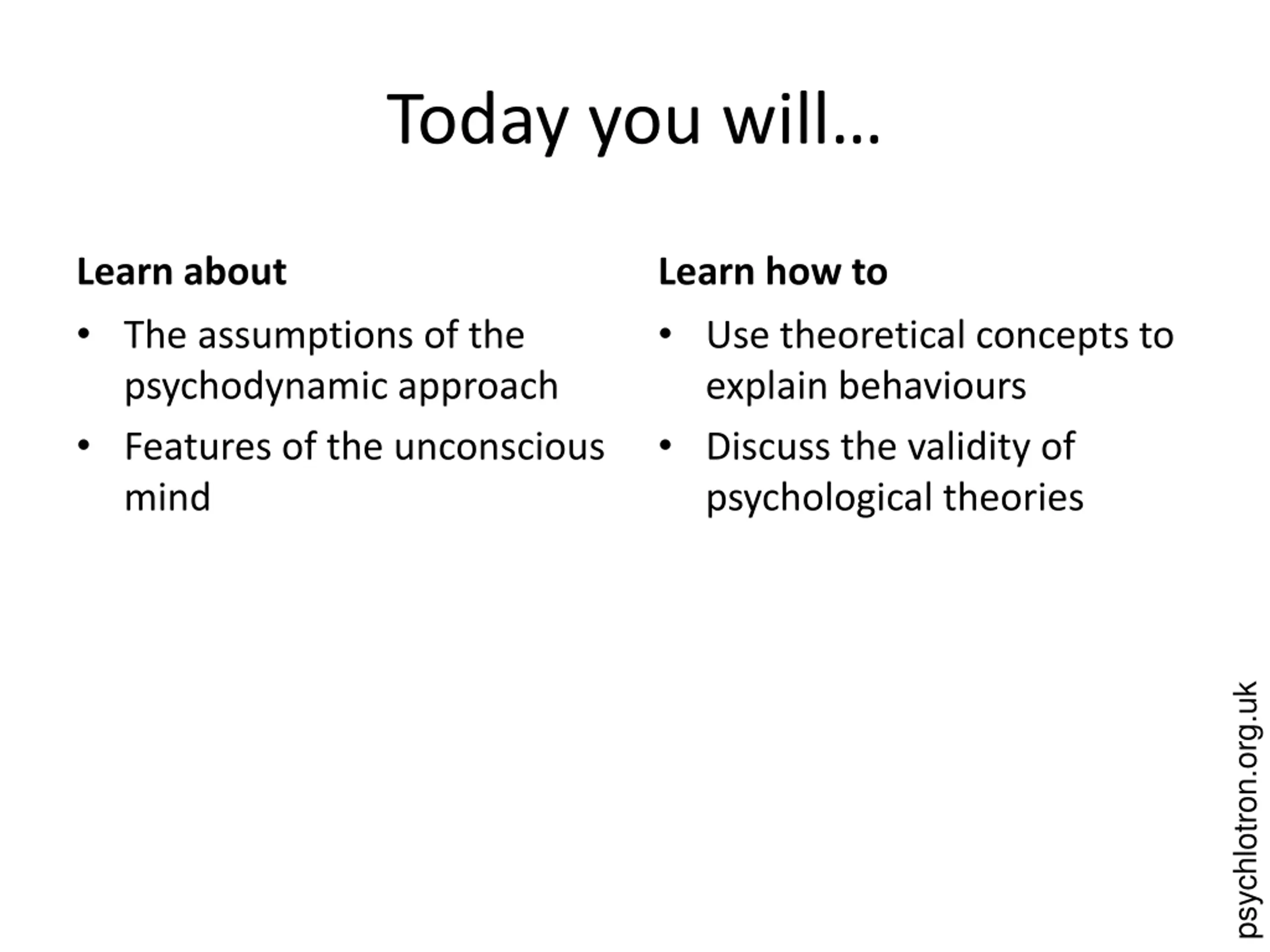 Today you will Learn about The assumptions of the psychodynamic approach Features of the unconscious mind Learn how to Use theoretical concepts to explain behaviours Discuss the validity of psychological theories psychlotron.org.uk
