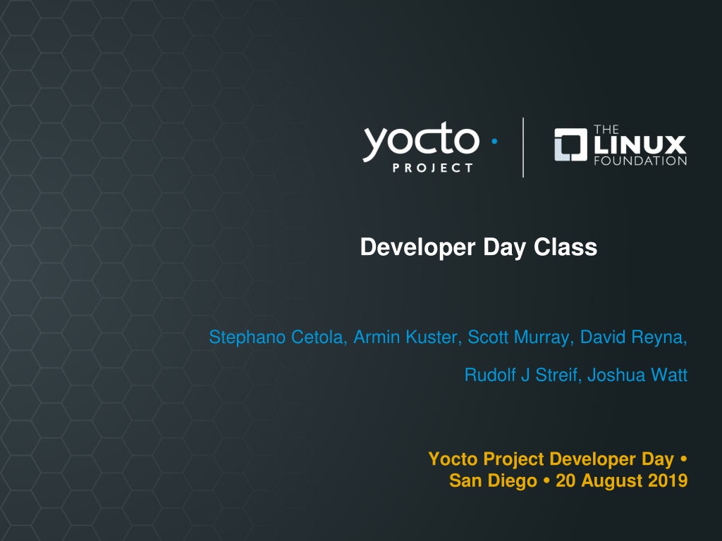 Developer Day Class Stephano Cetola, Armin Kuster, Scott Murray, David Reyna, Rudolf J Streif, Joshua Watt Yocto Project Developer Day San Diego 20 August 2019