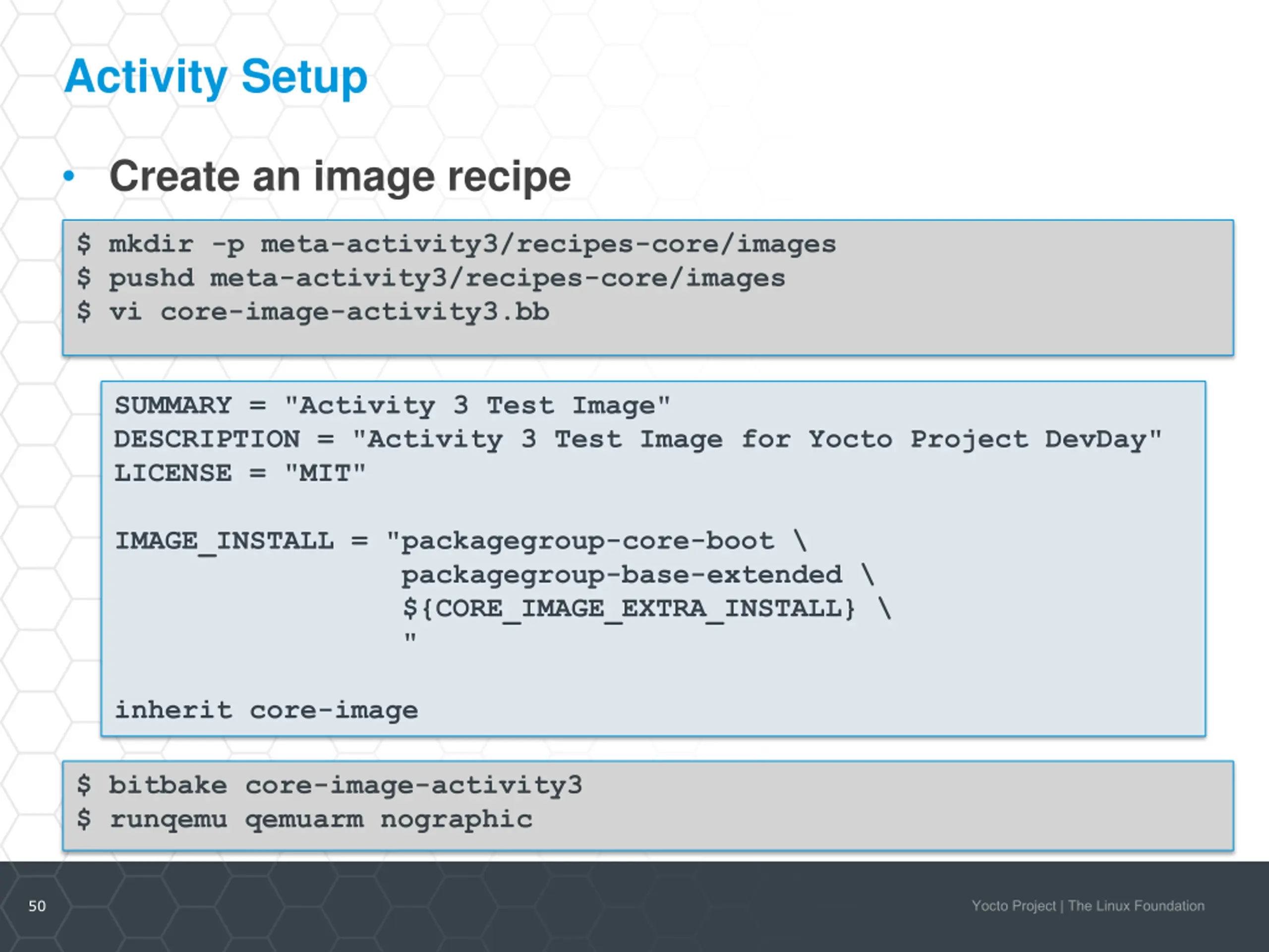Activity Setup Create an image recipe $ mkdir -p meta-activity3/recipes-core/images $ pushd meta-activity3/recipes-core/images $ vi core-image-activity3.bb SUMMARY = "Activity 3 Test Image" DESCRIPTION = "Activity 3 Test Image for Yocto Project DevDay" LICENSE = "MIT" IMAGE_INSTALL = "packagegroup-core-boot \ packagegroup-base-extended \ ${CORE_IMAGE_EXTRA_INSTALL} \ " inherit core-image $ bitbake core-image-activity3 $ runqemu qemuarm nographic 50
