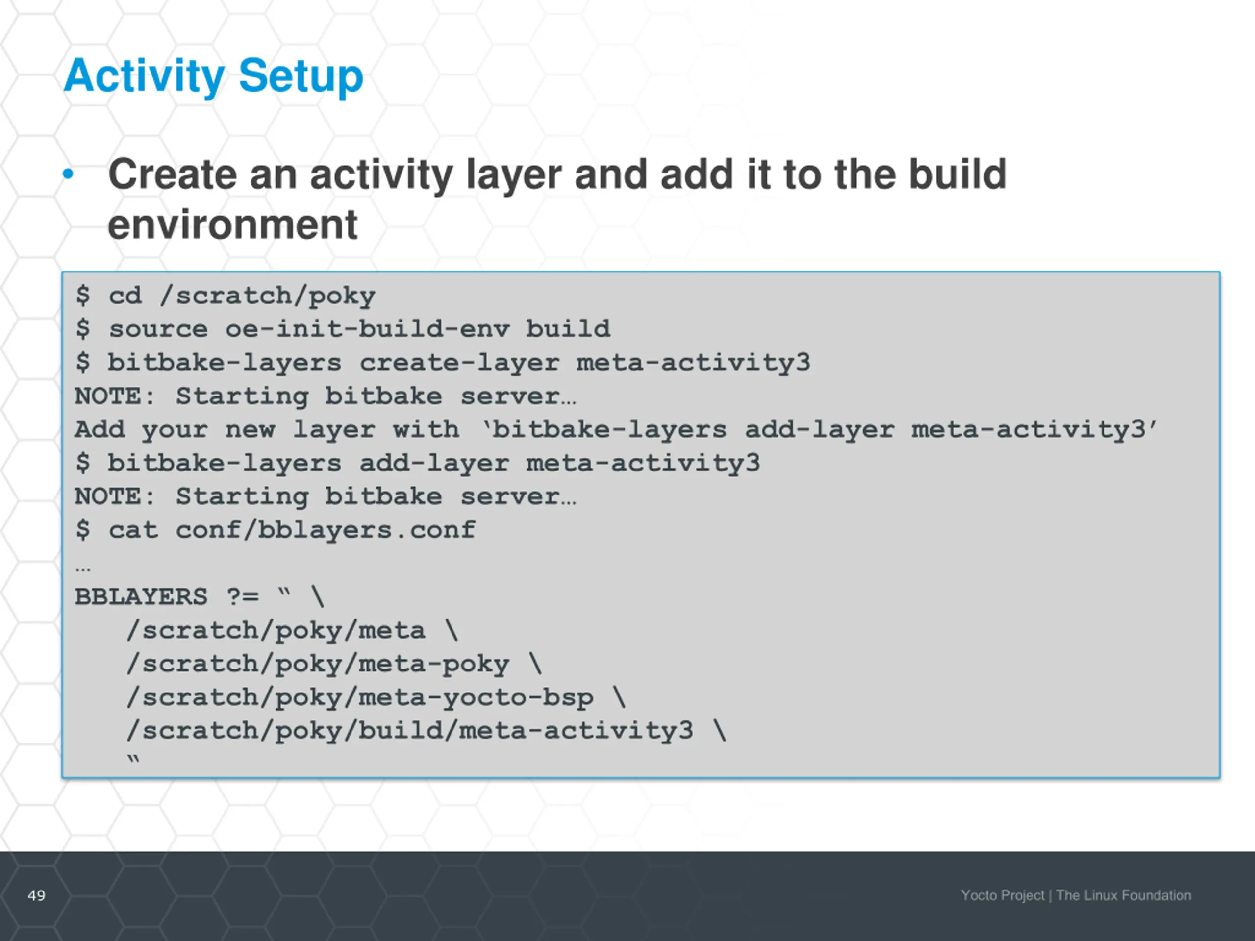 Activity Setup Create an activity layer and add it to the build environment $ cd /scratch/poky $ source oe-init-build-env build $ bitbake-layers create-layer meta-activity3 NOTE: Starting bitbake server Add your new layer with bitbake-layers add-layer meta-activity3 $ bitbake-layers add-layer meta-activity3 NOTE: Starting bitbake server $ cat conf/bblayers.conf BBLAYERS ?= \ /scratch/poky/meta \ /scratch/poky/meta-poky \ /scratch/poky/meta-yocto-bsp \ /scratch/poky/build/meta-activity3 \ 49