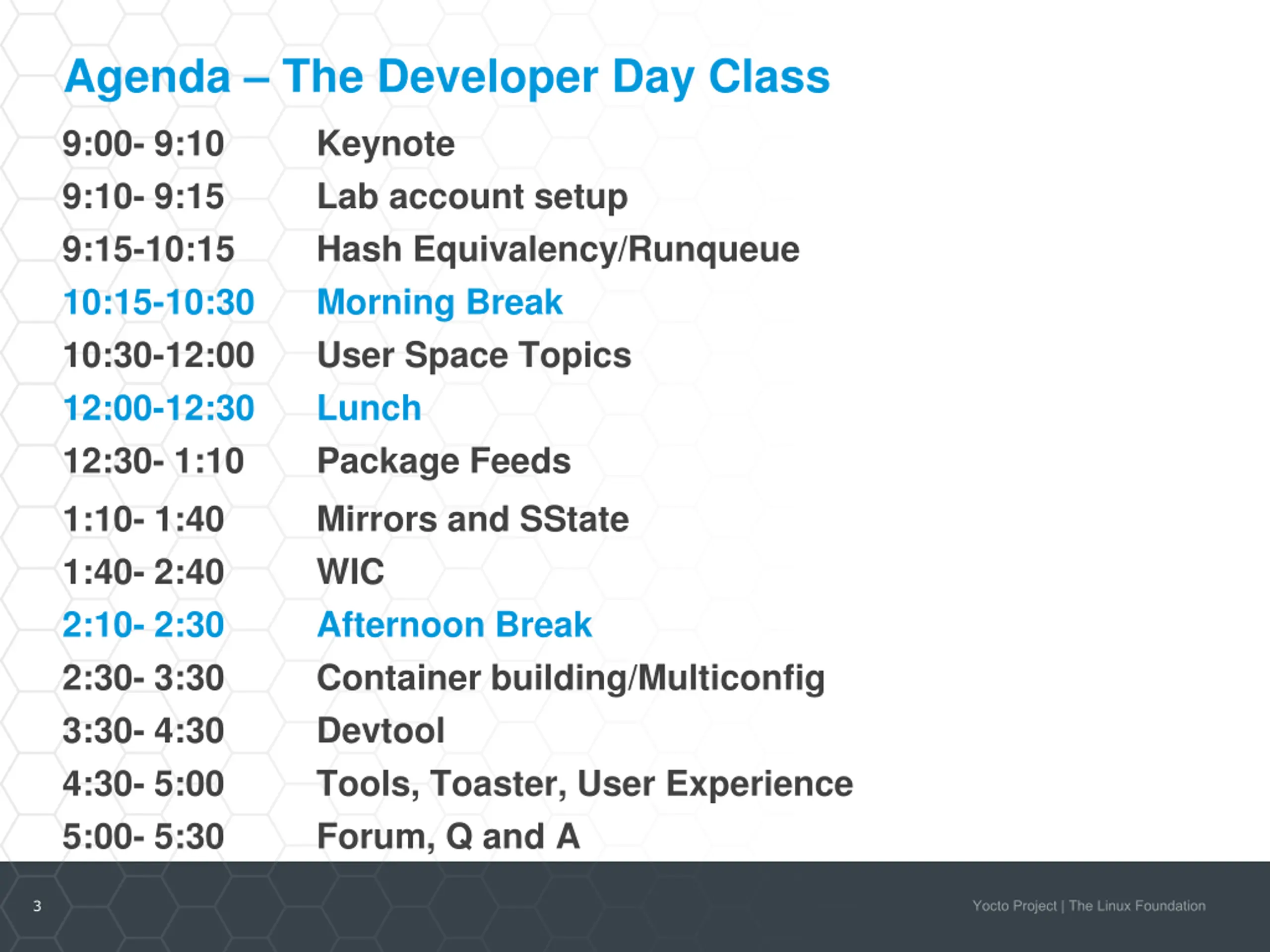 Agenda The Developer Day Class 9:00- 9:10 9:10- 9:15 9:15-10:15 10:15-10:30 10:30-12:00 12:00-12:30 12:30- 1:10 1:10- 1:40 1:40- 2:40 2:10- 2:30 2:30- 3:30 3:30- 4:30 4:30- 5:00 5:00- 5:30 Keynote Lab account setup Hash Equivalency/Runqueue Morning Break User Space Topics Lunch Package Feeds Mirrors and SState WIC Afternoon Break Container building/Multiconfig Devtool Tools, Toaster, User Experience Forum, Q and A 3