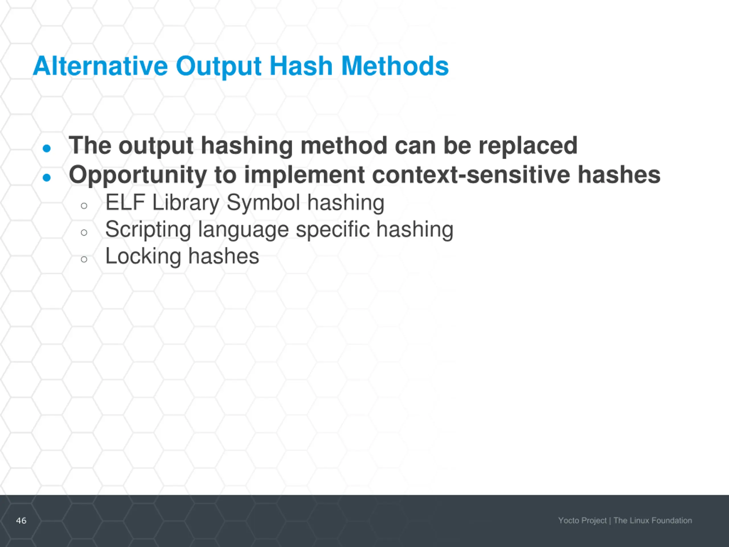 Alternative Output Hash Methods The output hashing method can be replaced Opportunity to implement context-sensitive hashes ELF Library Symbol hashing Scripting language specific hashing Locking hashes 46