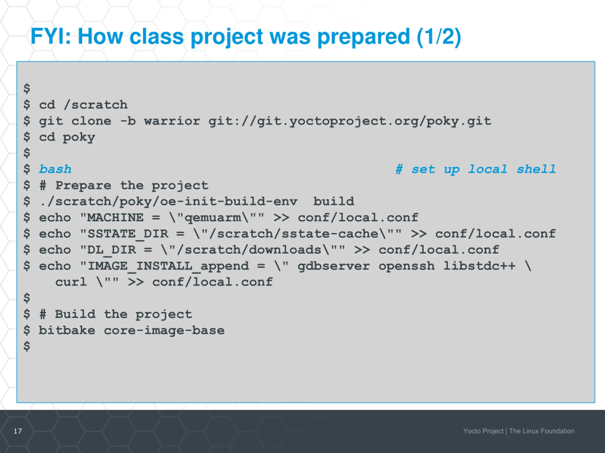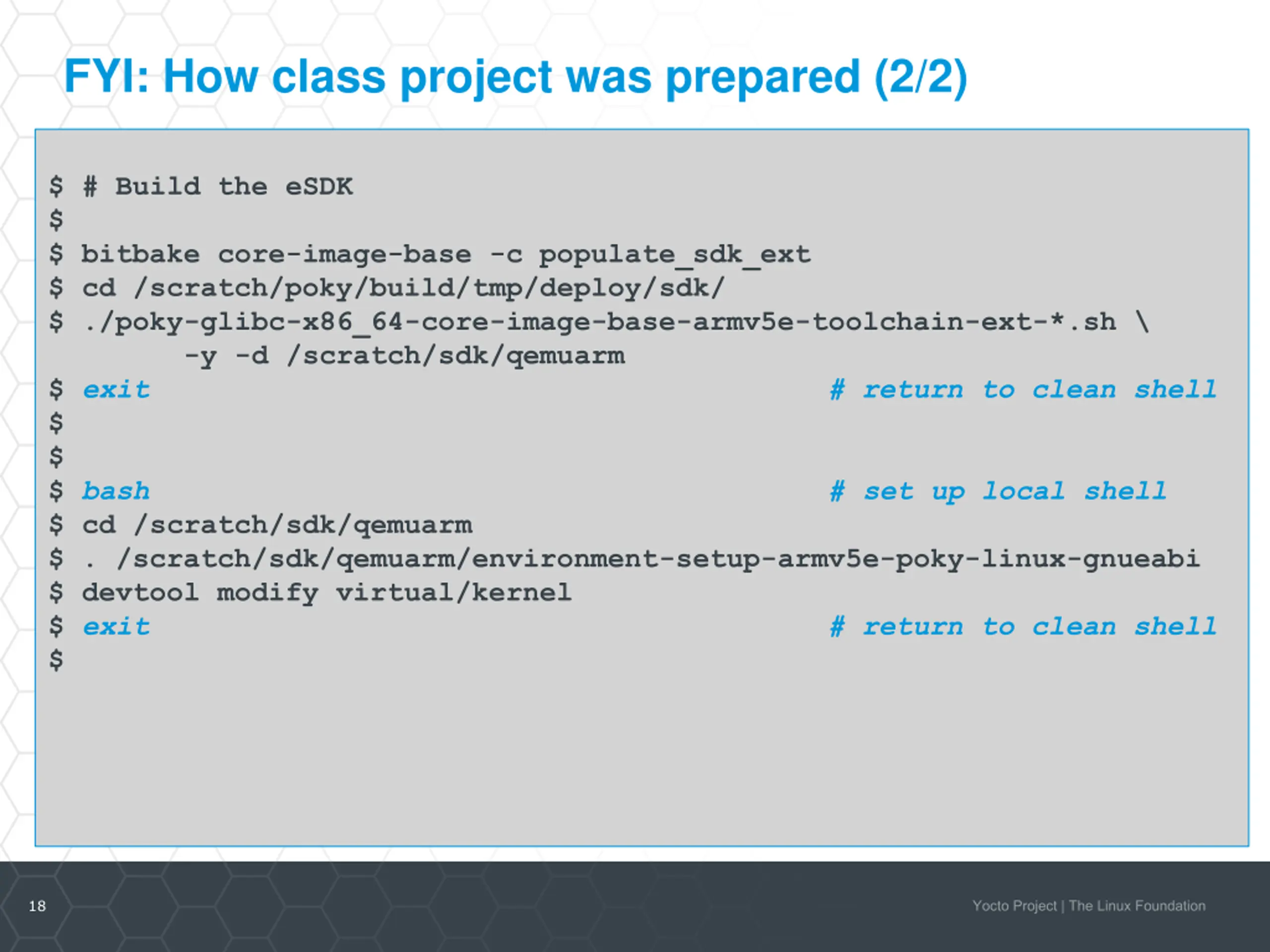 FYI: How class project was prepared (1/2) $ $ cd /scratch $ git clone -b warrior git://git.yoctoproject.org/poky.git $ cd poky $ $ bash # set up local shell $ # Prepare the project $ ./scratch/poky/oe-init-build-env build $ echo "MACHINE = \"qemuarm\"" >> conf/local.conf $ echo "SSTATE_DIR = \"/scratch/sstate-cache\"" >> conf/local.conf $ echo "DL_DIR = \"/scratch/downloads\"" >> conf/local.conf $ echo "IMAGE_INSTALL_append = \" gdbserver openssh libstdc++ \ curl \"" >> conf/local.conf $ $ # Build the project $ bitbake core-image-base $ 17