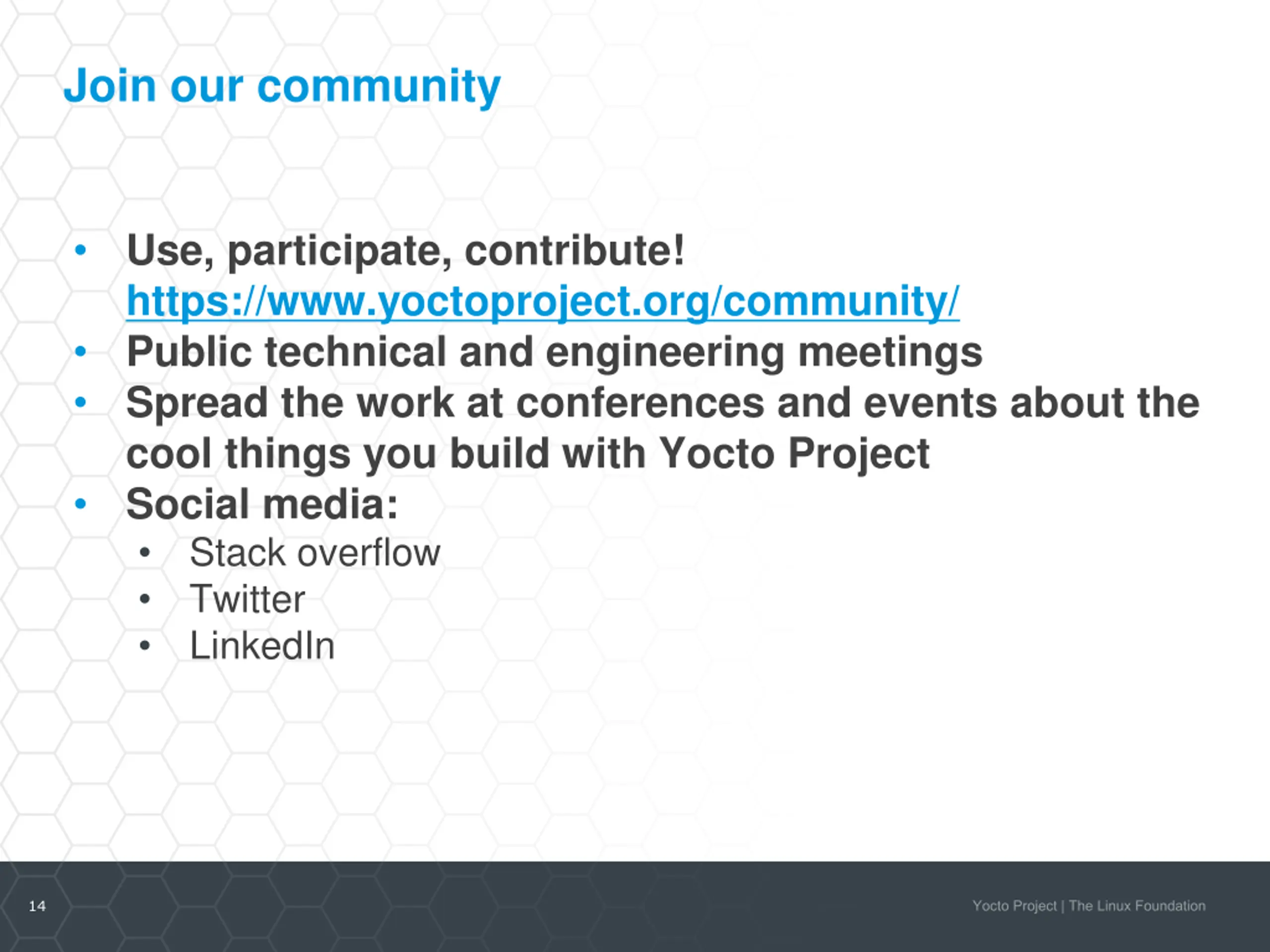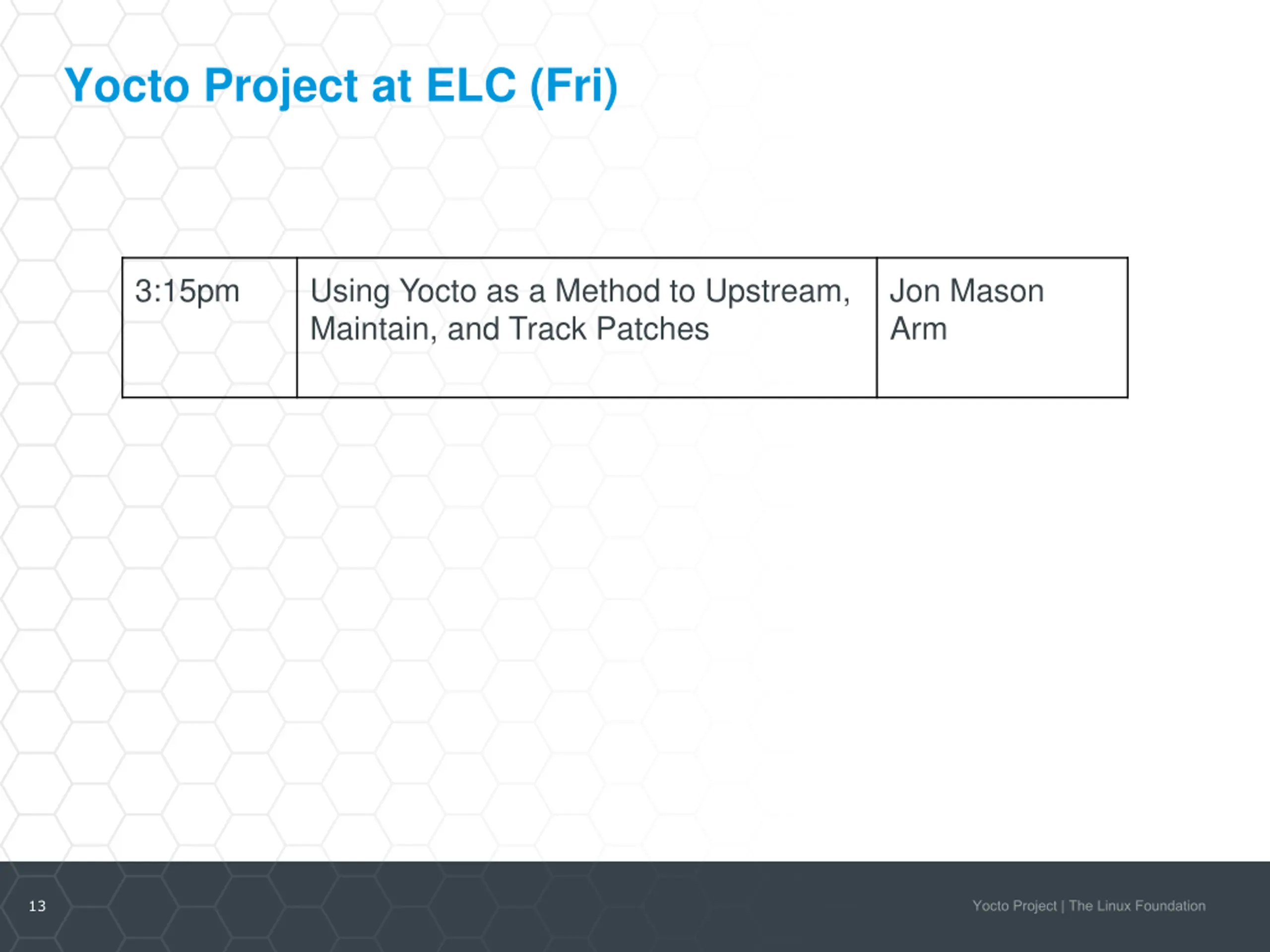 Yocto Project at ELC (Fri) 3:15pm Using Yocto as a Method to Upstream, Maintain, and Track Patches Jon Mason Arm 13