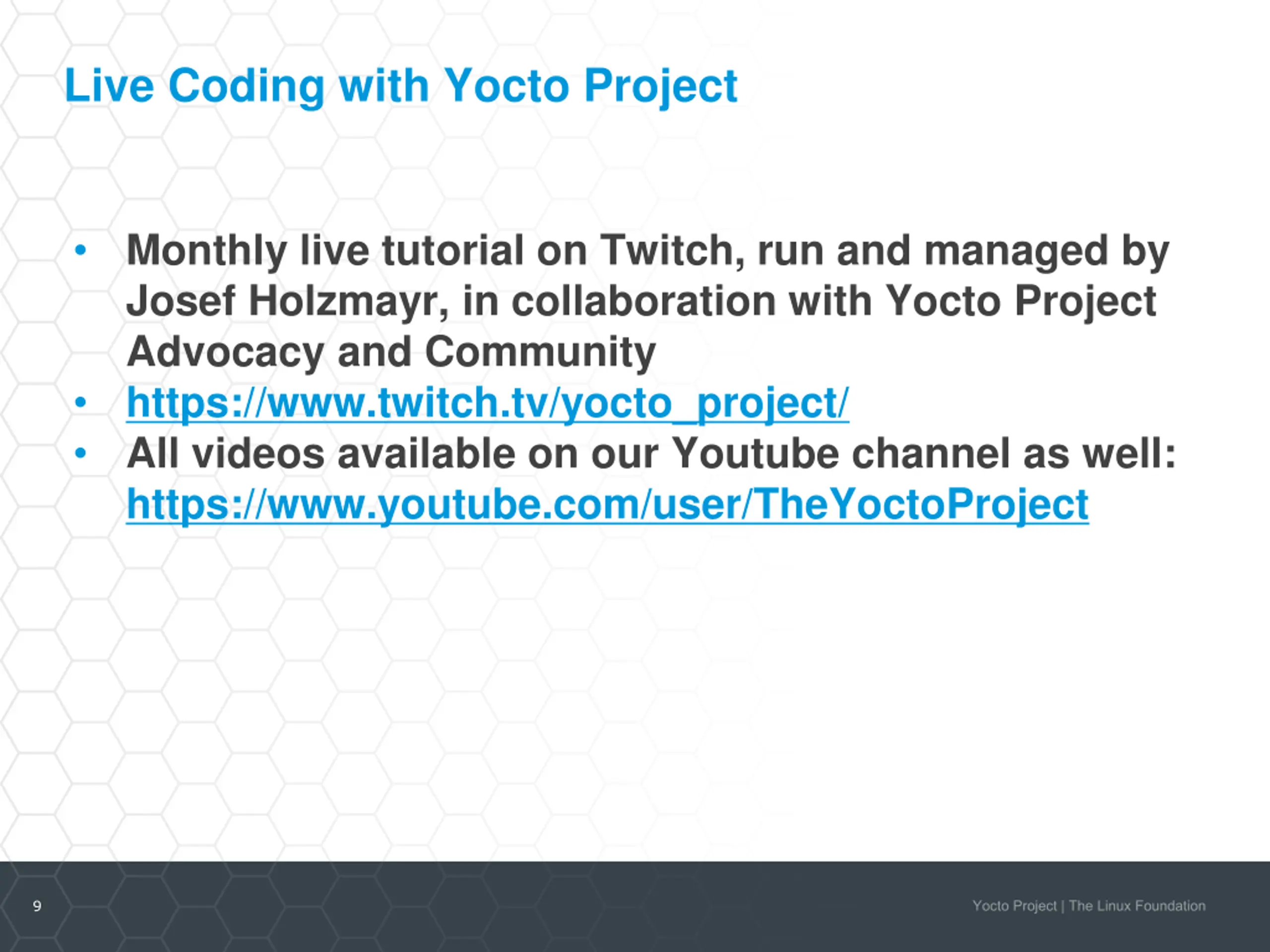 Live Coding with Yocto Project Monthly live tutorial on Twitch, run and managed by Josef Holzmayr, in collaboration with Yocto Project Advocacy and Community https://www.twitch.tv/yocto_project/ All videos available on our Youtube channel as well: https://www.youtube.com/user/TheYoctoProject 9