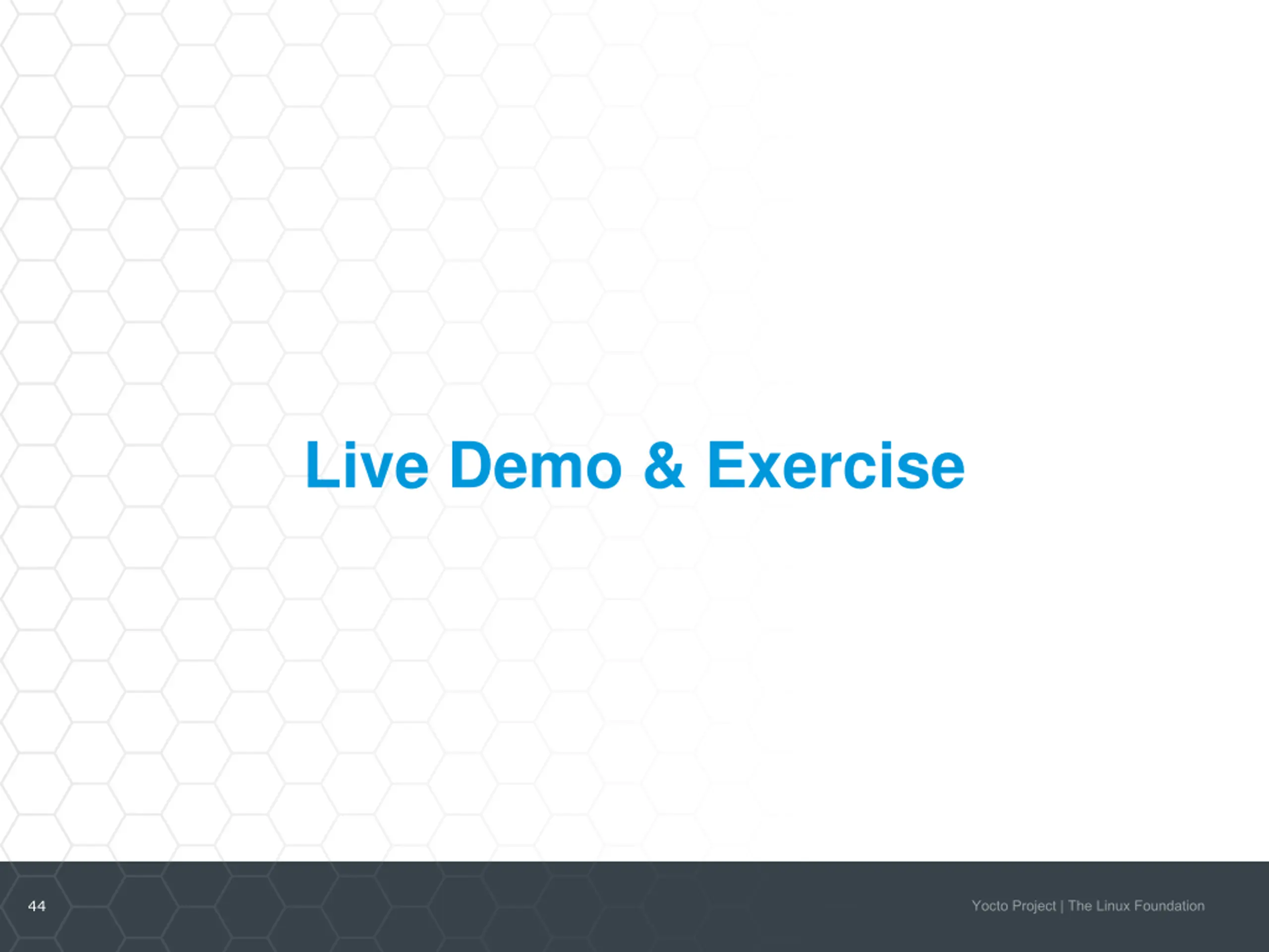 Signature Generation with Hash Equivalence Server A:do_populate_sysroot_setscene A:do_populate_sysroot:222 taskhash: bbb unihash: 222 Hash server outhash 123 = taskhash 222 outhash 123 = taskhash bbb B:do_populate_sysroot_setscene B:do_populate_sysroot:444 taskhash: 444 unihash: 444 43