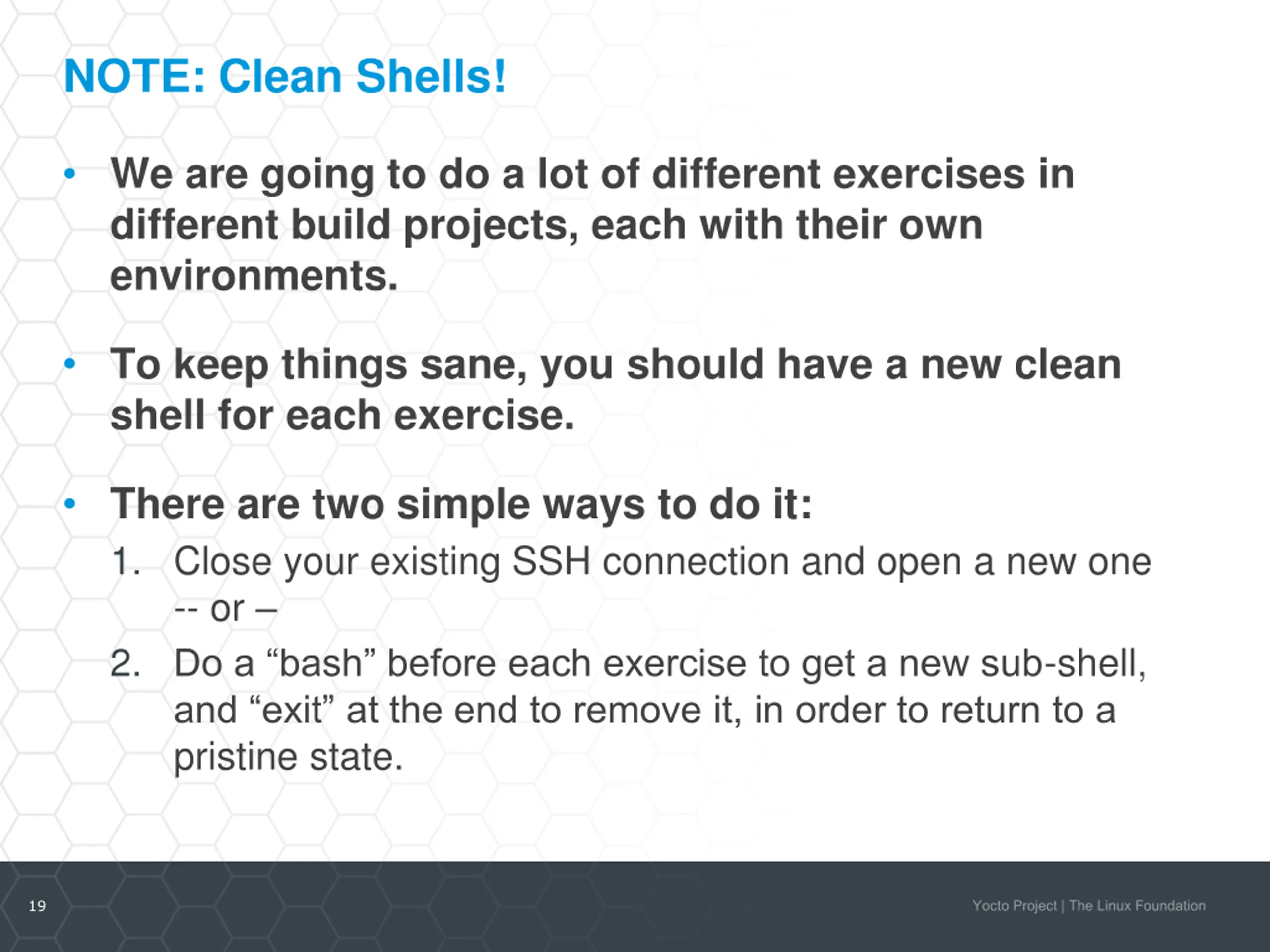 NOTE: Clean Shells! We are going to do a lot of different exercises in different build projects, each with their own environments. To keep things sane, you should have a new clean shell for each exercise. There are two simple ways to do it: 1. Close your existing SSH connection and open a new one -- or 2. Do a bash before each exercise to get a new sub-shell, and exit at the end to remove it, in order to return to a pristine state. 19