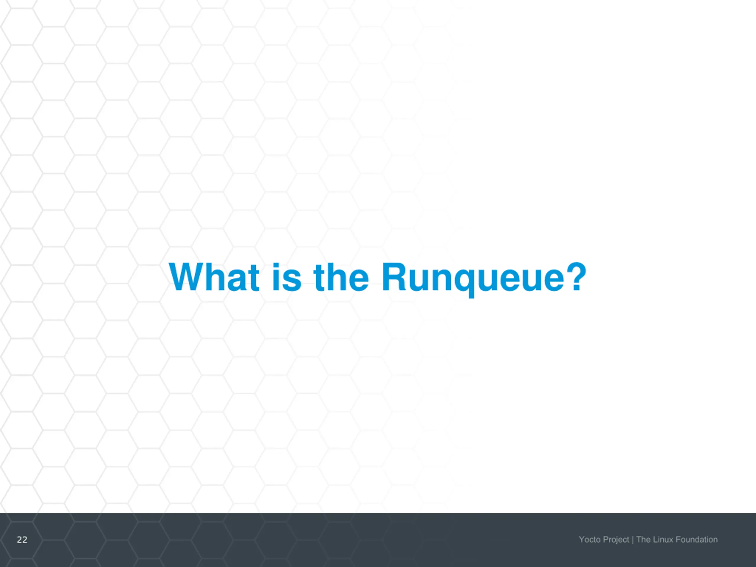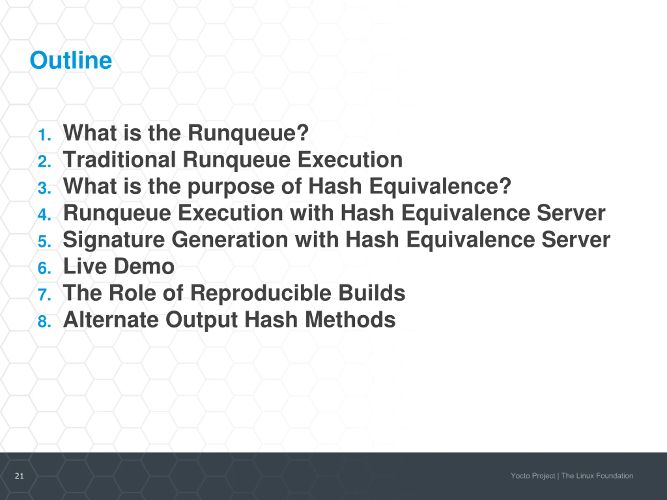 Outline 1. What is the Runqueue? 2. Traditional Runqueue Execution 3. What is the purpose of Hash Equivalence? 4. Runqueue Execution with Hash Equivalence Server 5. Signature Generation with Hash Equivalence Server 6. Live Demo 7. The Role of Reproducible Builds 8. Alternate Output Hash Methods 21