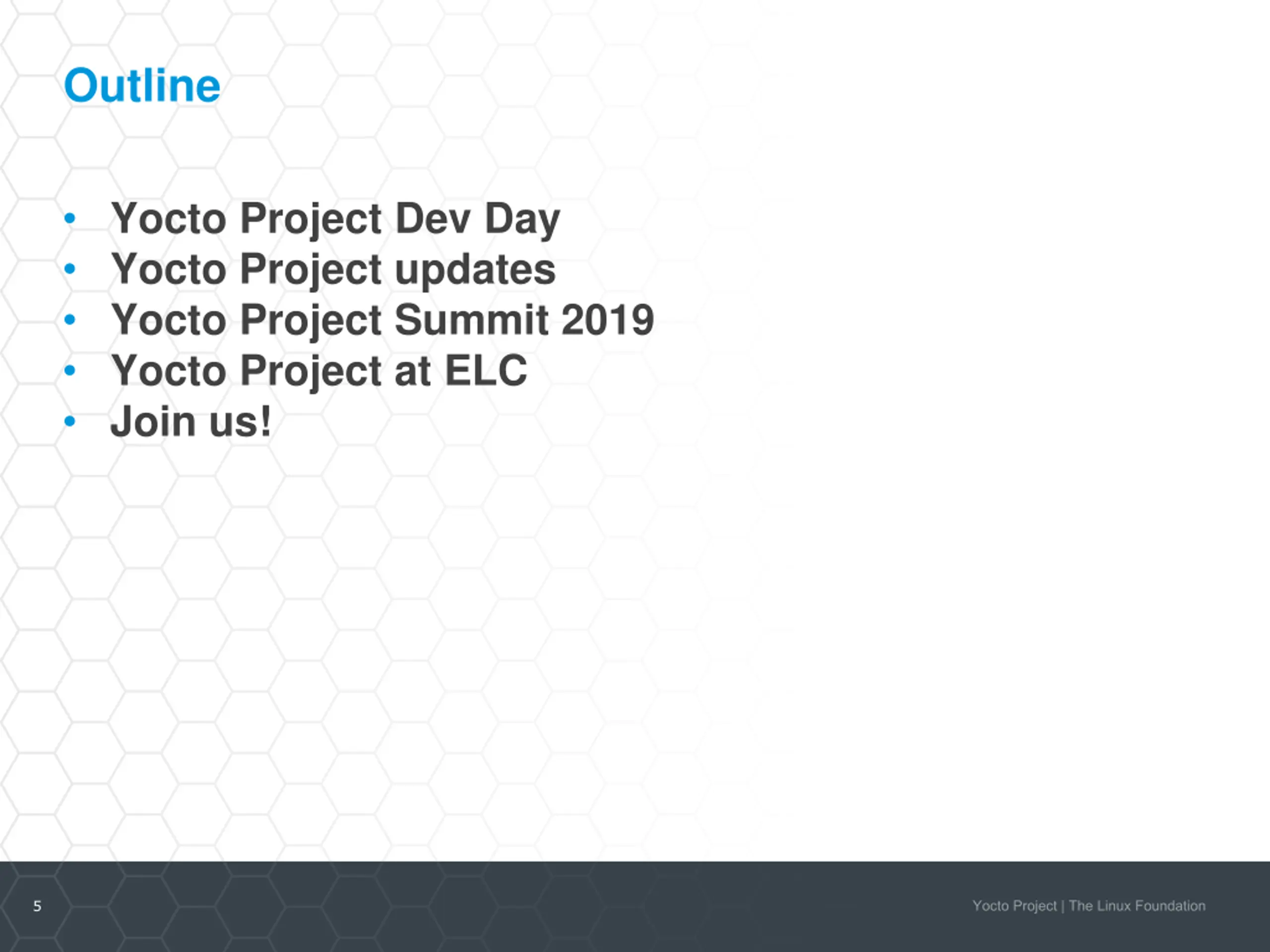 Outline Yocto Project Dev Day Yocto Project updates Yocto Project Summit 2019 Yocto Project at ELC Join us! 5