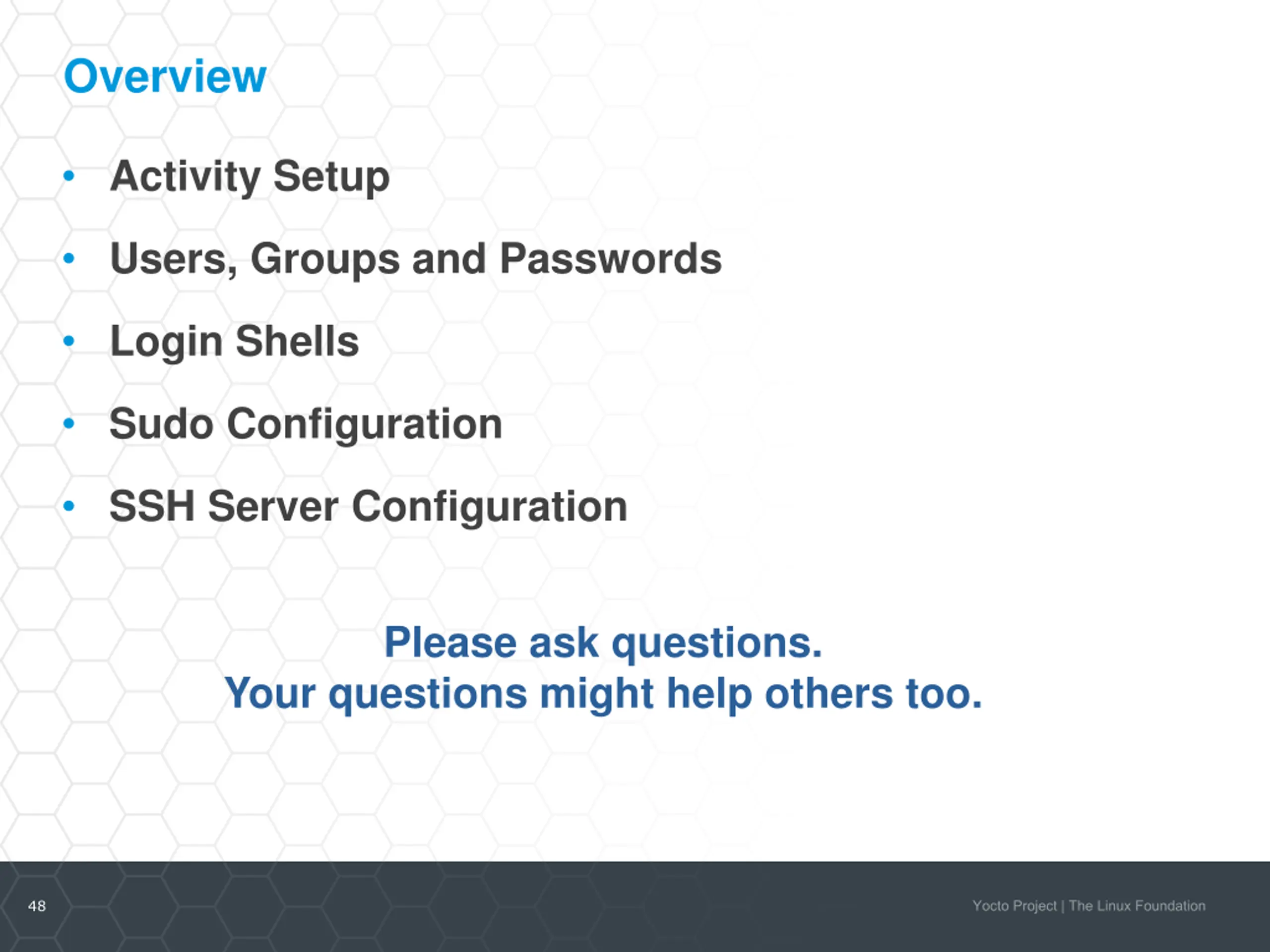 Overview Activity Setup Users, Groups and Passwords Login Shells Sudo Configuration SSH Server Configuration Please ask questions. Your questions might help others too. 48