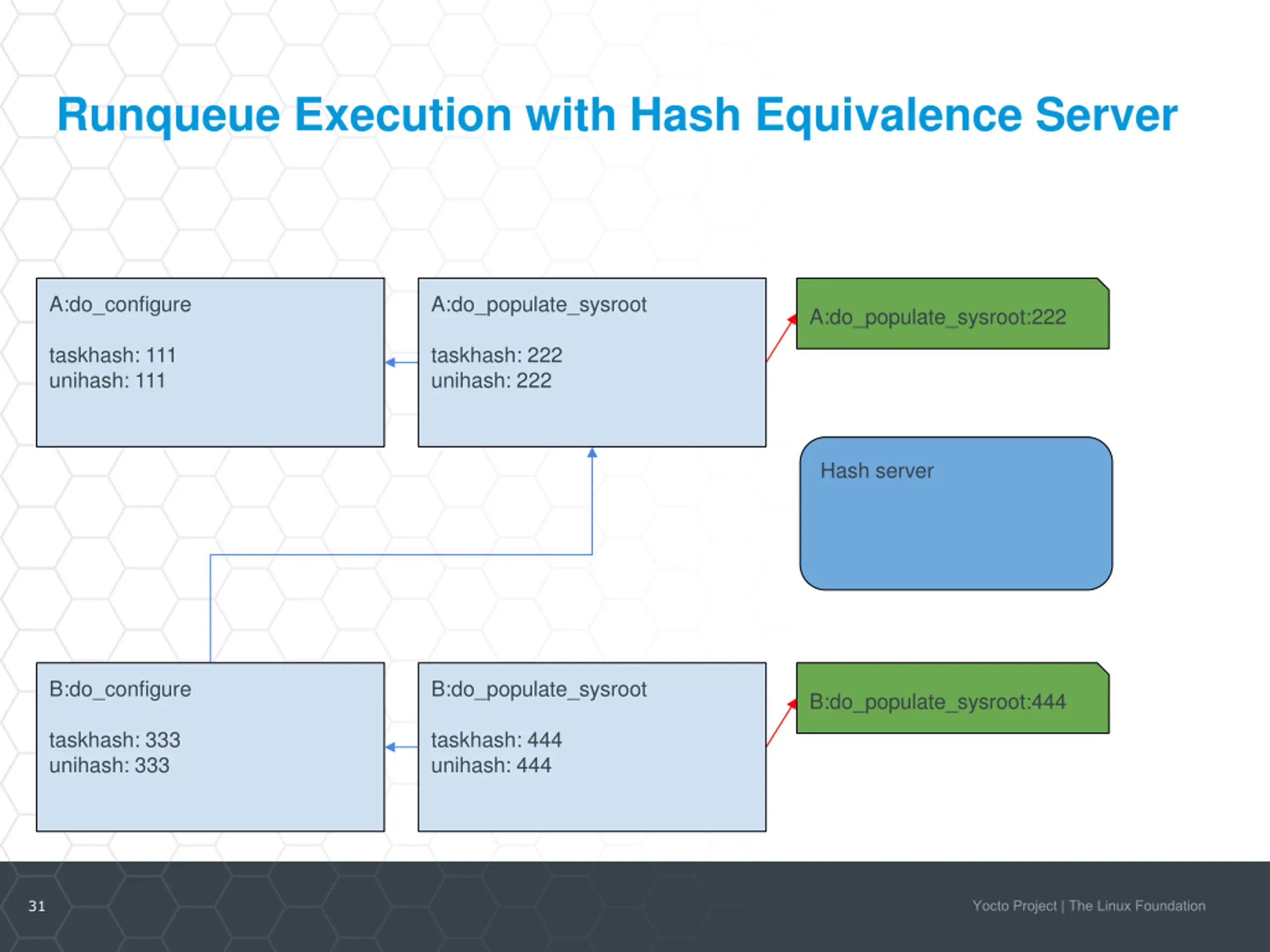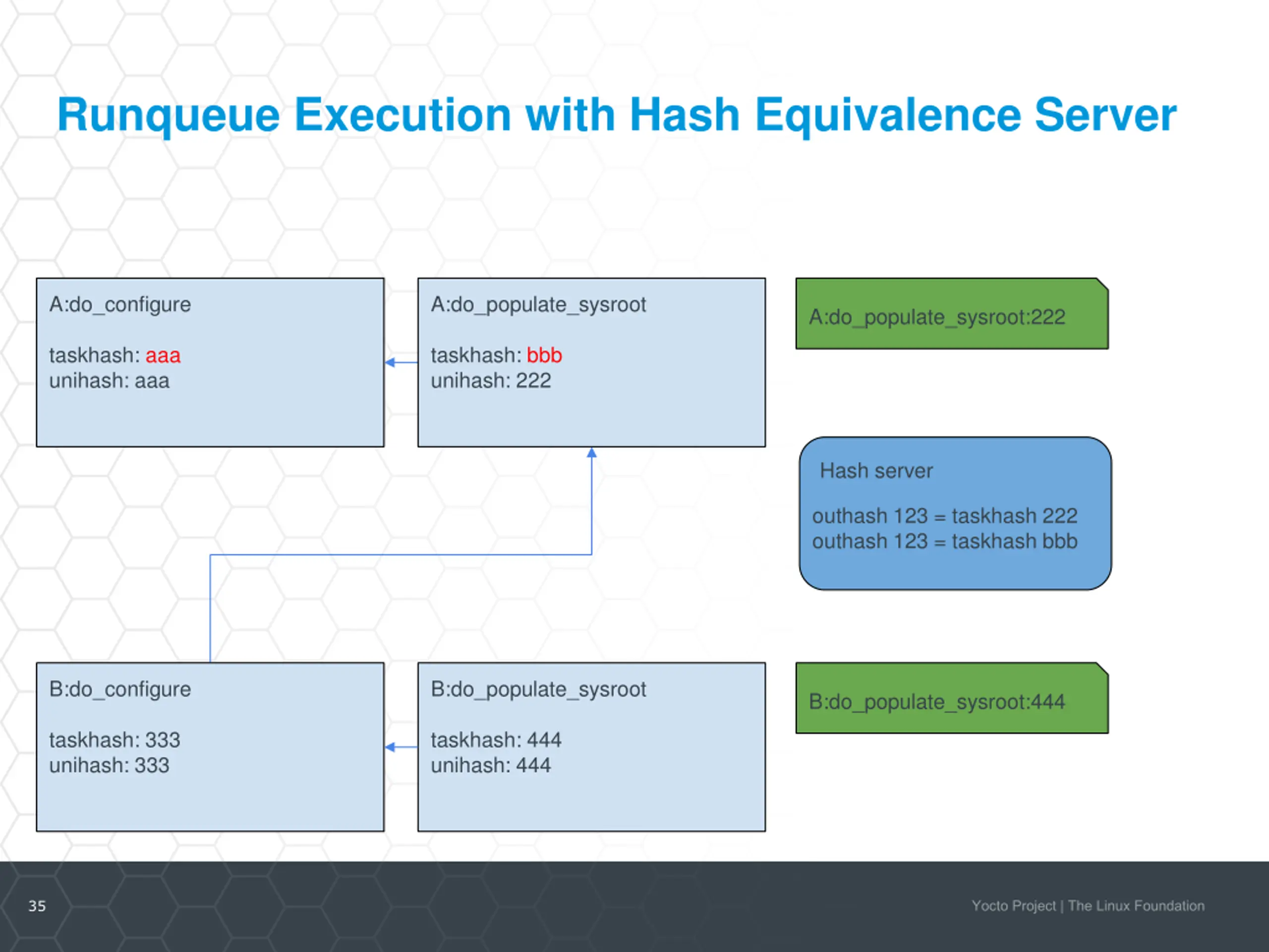 Runqueue Execution with Hash Equivalence Server A:do_configure A:do_populate_sysroot A:do_populate_sysroot:222 taskhash: aaa unihash: aaa taskhash: bbb unihash: bbb Hash server outhash 123 = taskhash 222 B:do_configure B:do_populate_sysroot B:do_populate_sysroot:444 taskhash: ccc unihash: ccc taskhash: ddd unihash: ddd 33