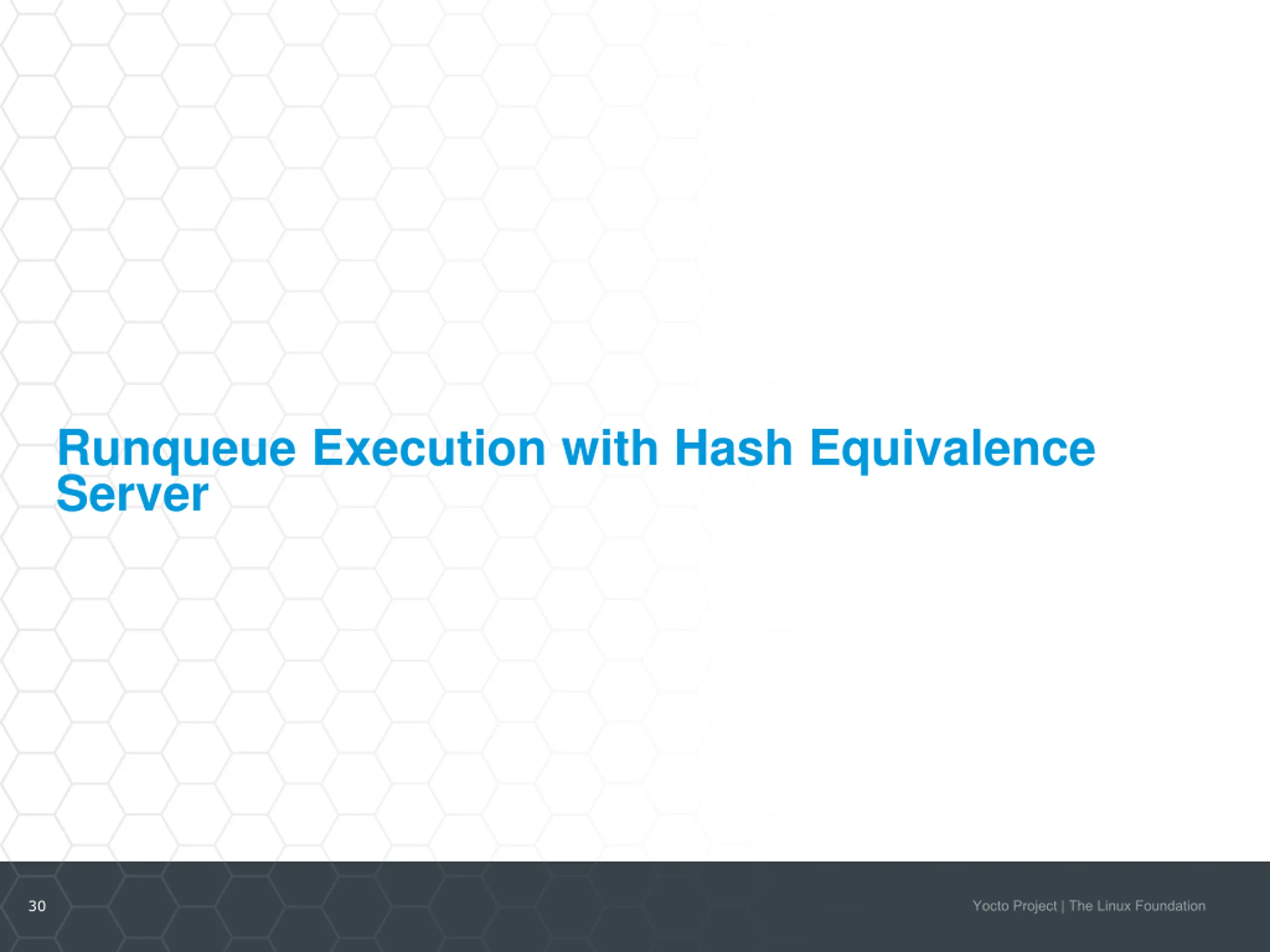 What is the purpose of Hash Equivalence? Improve the reuse of sstate Reduce unnecessary rebuilds of recipes Reduce build times 29