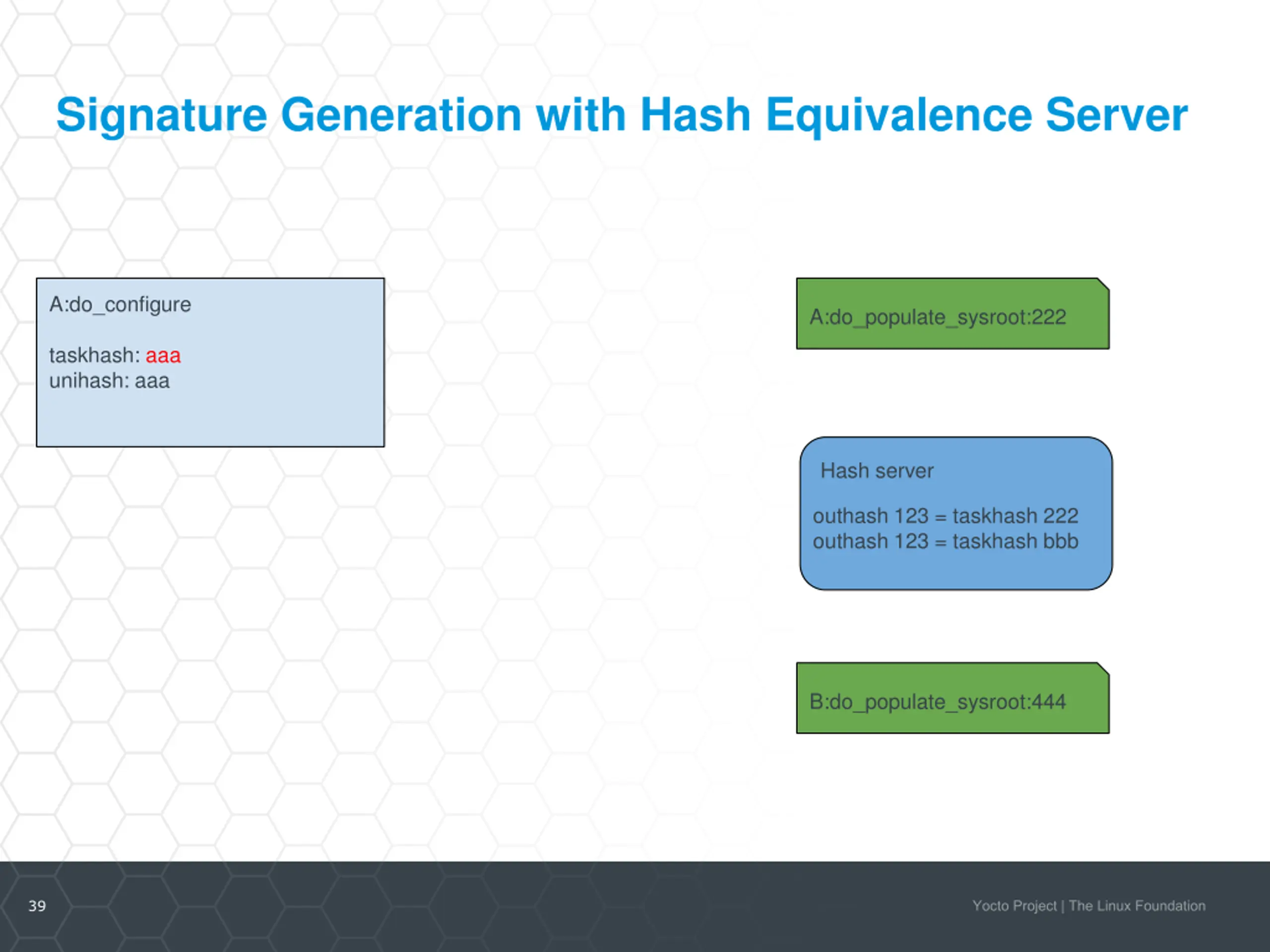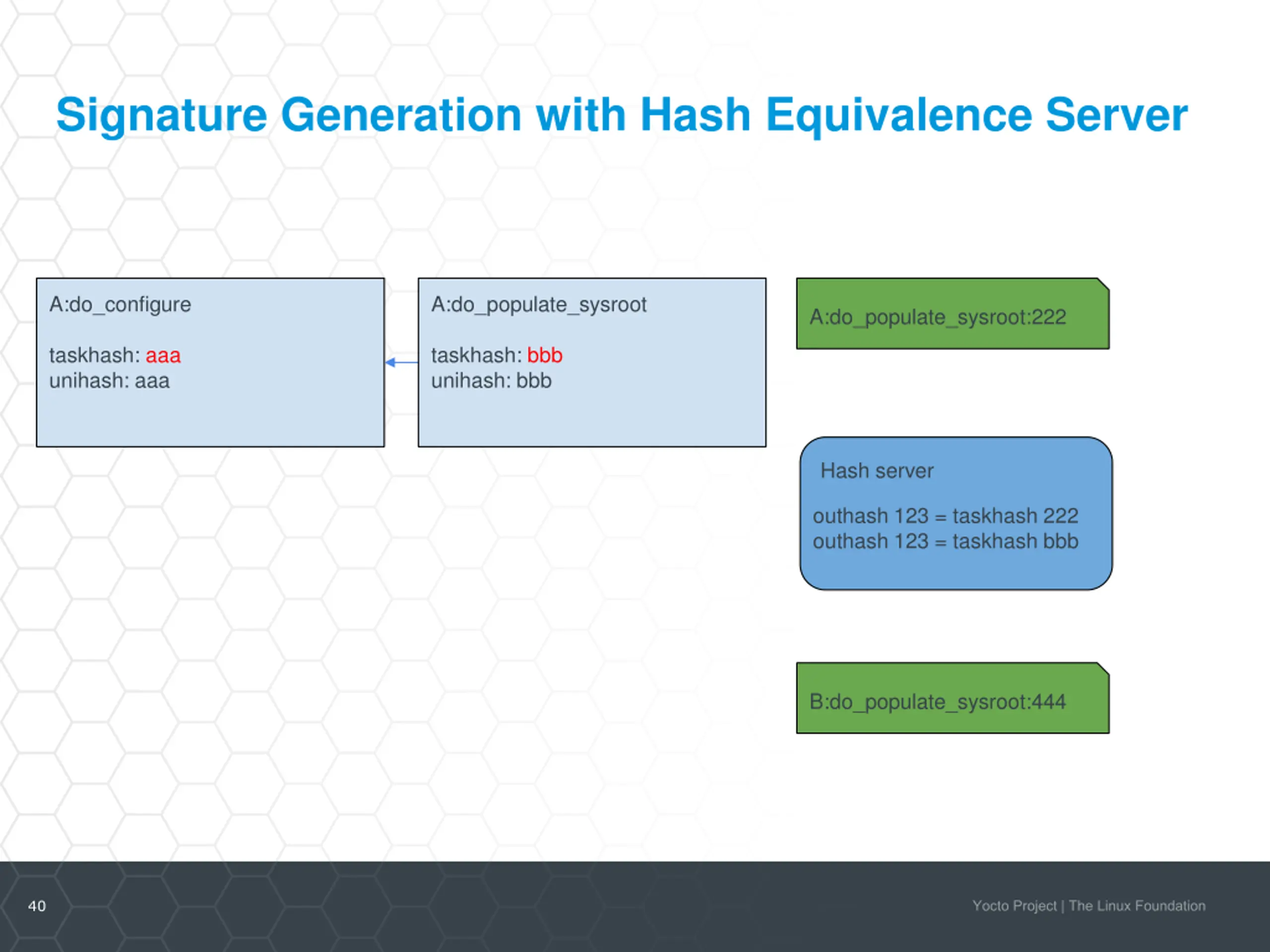 Signature Generation with Hash Equivalence Server A:do_configure A:do_populate_sysroot:222 taskhash: aaa unihash: aaa Hash server outhash 123 = taskhash 222 outhash 123 = taskhash bbb B:do_populate_sysroot:444 39
