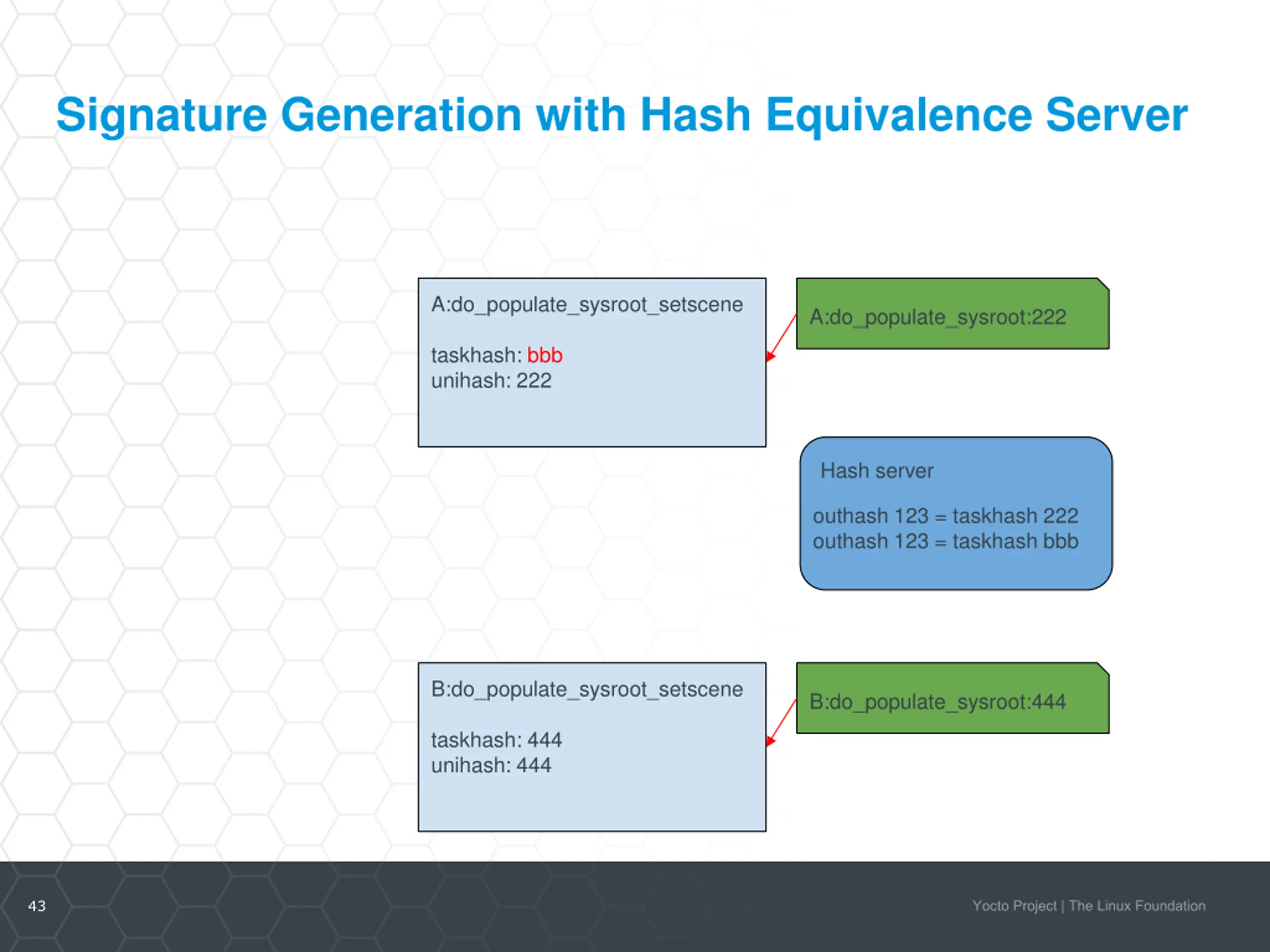 Signature Generation with Hash Equivalence Server A:do_configure A:do_populate_sysroot A:do_populate_sysroot:222 taskhash: aaa unihash: aaa taskhash: bbb unihash: 222 Hash server outhash 123 = taskhash 222 outhash 123 = taskhash bbb B:do_configure B:do_populate_sysroot B:do_populate_sysroot:444 taskhash: 333 unihash: 333 taskhash: 444 unihash: 444 42