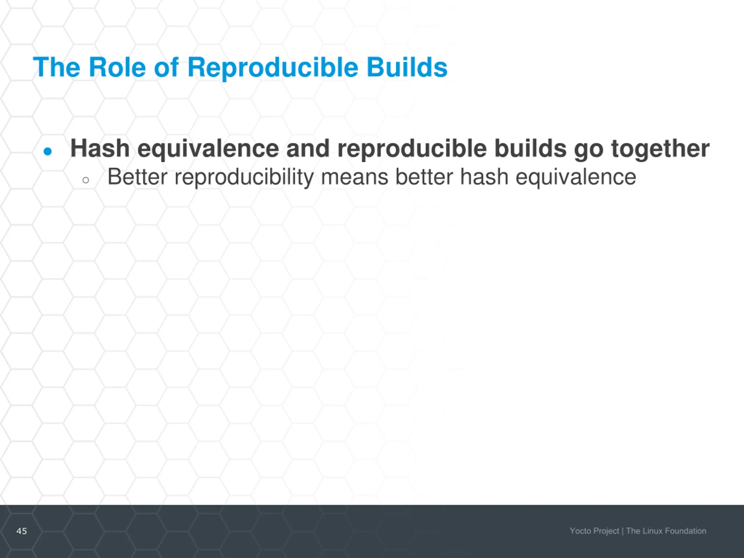 The Role of Reproducible Builds Hash equivalence and reproducible builds go together Better reproducibility means better hash equivalence 45
