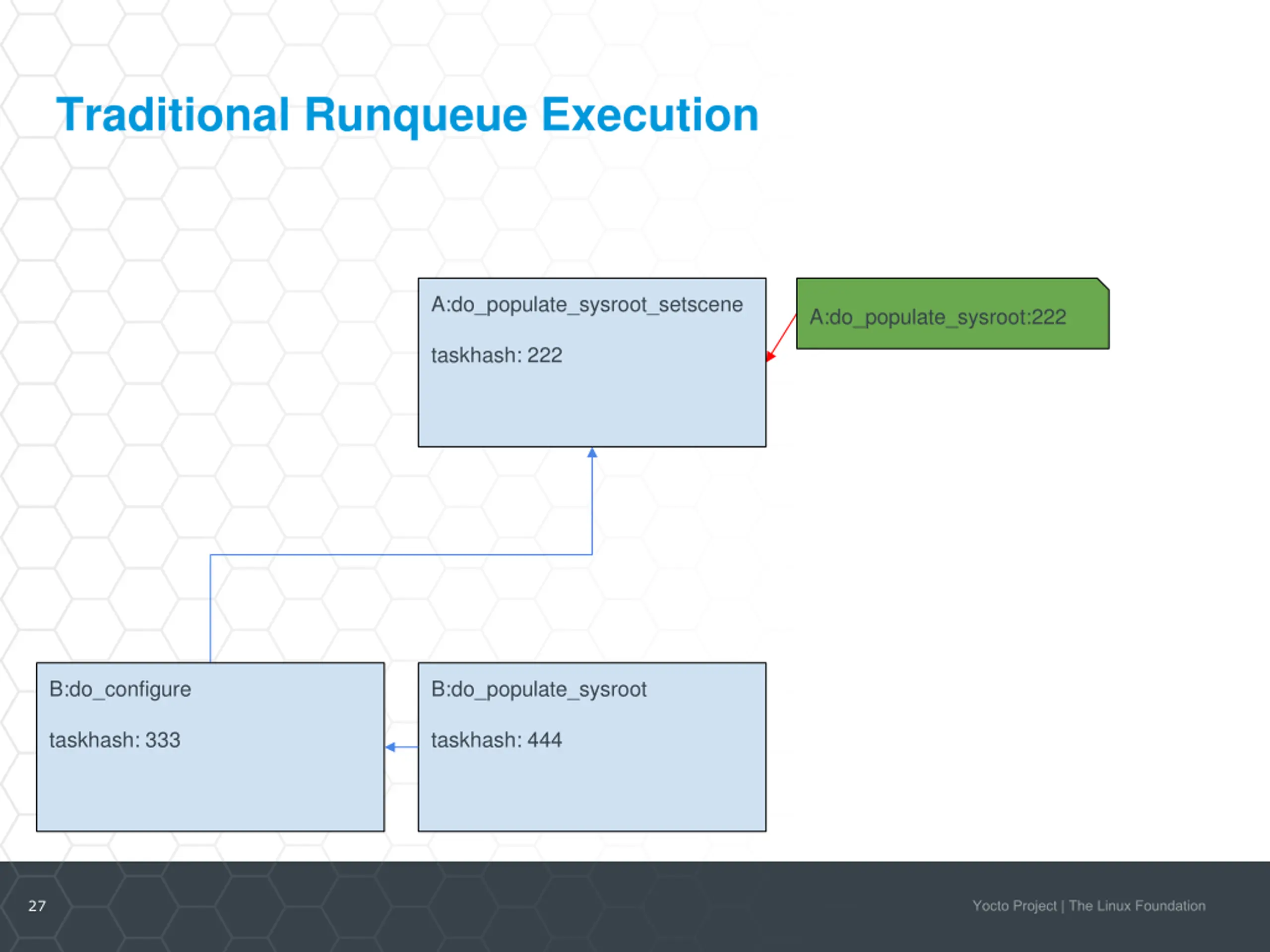 Traditional Runqueue Execution A:do_configure A:do_populate_sysroot A:do_populate_sysroot:222 taskhash: 111 taskhash: 222 B:do_configure B:do_populate_sysroot B:do_populate_sysroot:444 taskhash: 333 taskhash: 444 26