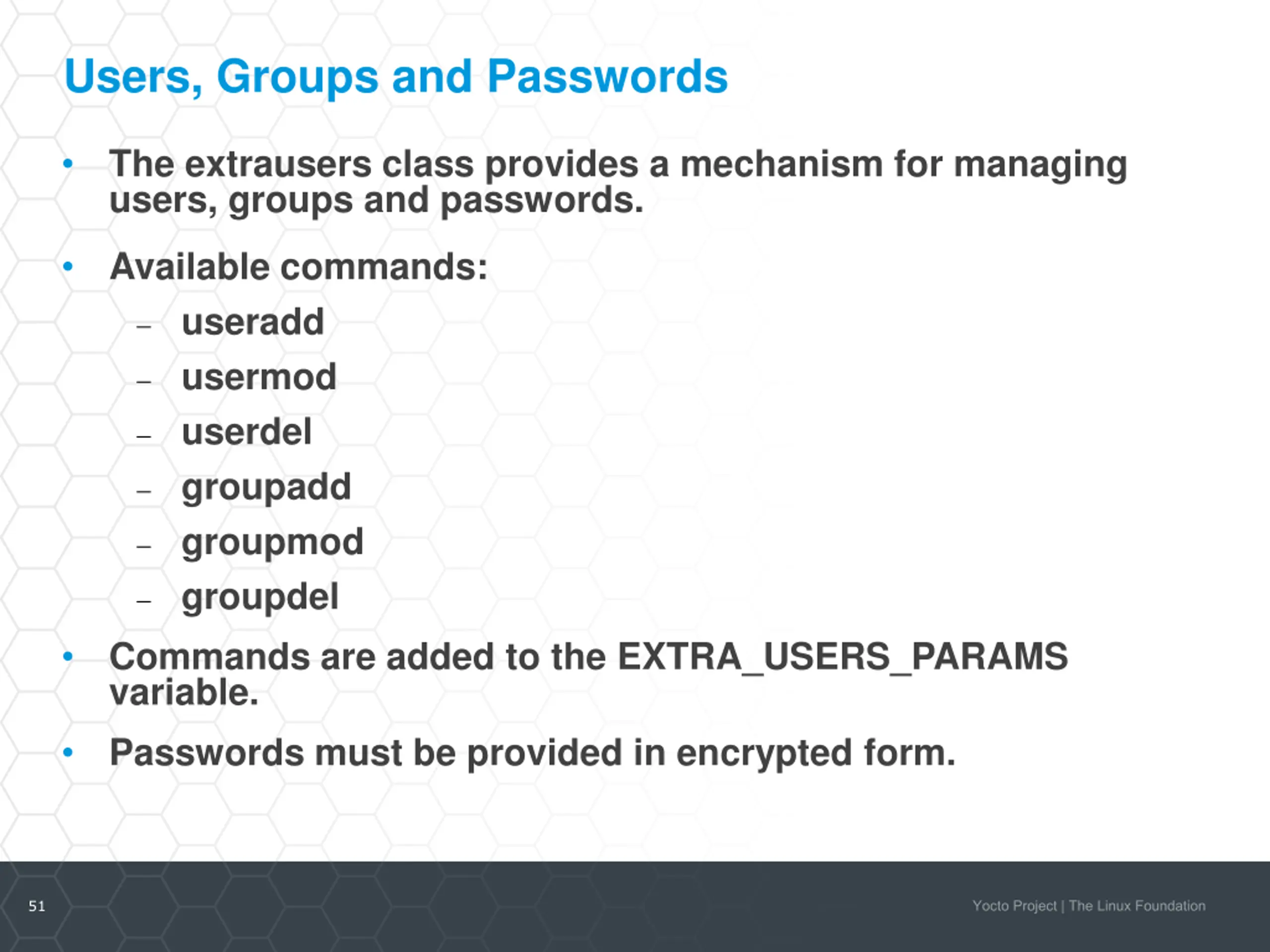 Users, Groups and Passwords The extrausers class provides a mechanism for managing users, groups and passwords. Available commands: useradd usermod userdel groupadd groupmod groupdel Commands are added to the EXTRA_USERS_PARAMS variable. Passwords must be provided in encrypted form. 51