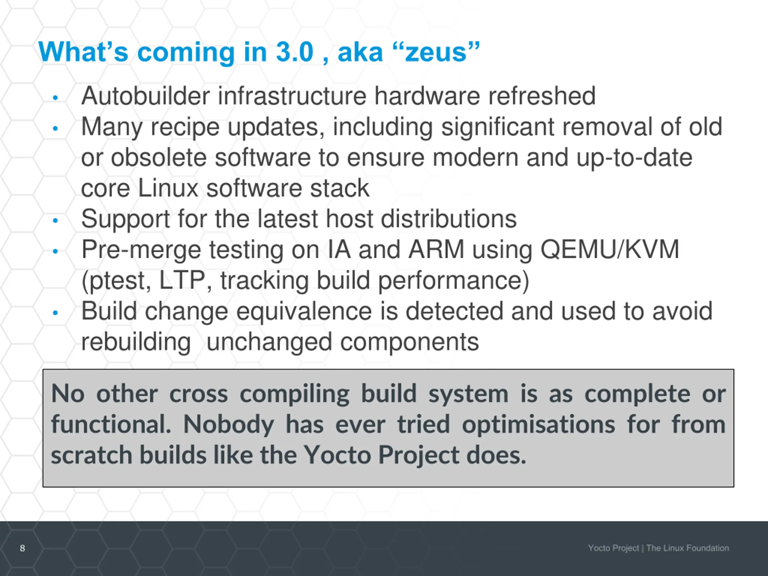 Whats coming in 3.0 , aka zeus Autobuilder infrastructure hardware refreshed Many recipe updates, including significant removal of old or obsolete software to ensure modern and up-to-date core Linux software stack Support for the latest host distributions Pre-merge testing on IA and ARM using QEMU/KVM (ptest, LTP, tracking build performance) Build change equivalence is detected and used to avoid rebuilding unchanged components No other cross compiling build system is as complete or functional. Nobody has ever tried optimisations for from scratch builds like the Yocto Project does. 8