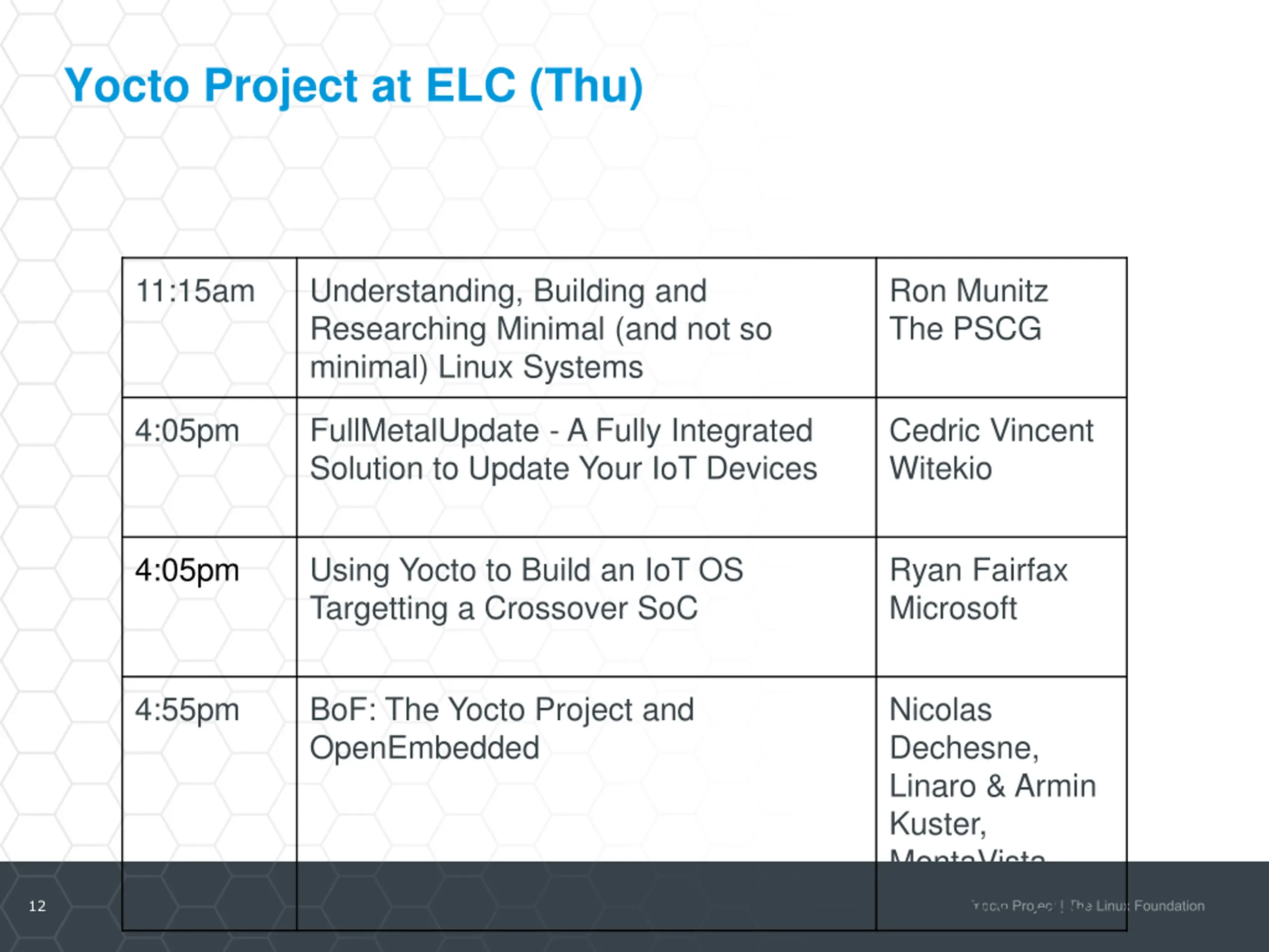 Yocto Project at ELC (Thu) 11:15am Understanding, Building and Researching Minimal (and not so minimal) Linux Systems Ron Munitz The PSCG 4:05pm FullMetalUpdate - A Fully Integrated Solution to Update Your IoT Devices Cedric Vincent Witekio 4:05pm Using Yocto to Build an IoT OS Targetting a Crossover SoC Ryan Fairfax Microsoft 4:55pm BoF: The Yocto Project and OpenEmbedded Nicolas Dechesne, Linaro & Armin Kuster, MontaVista Software, LLC 12