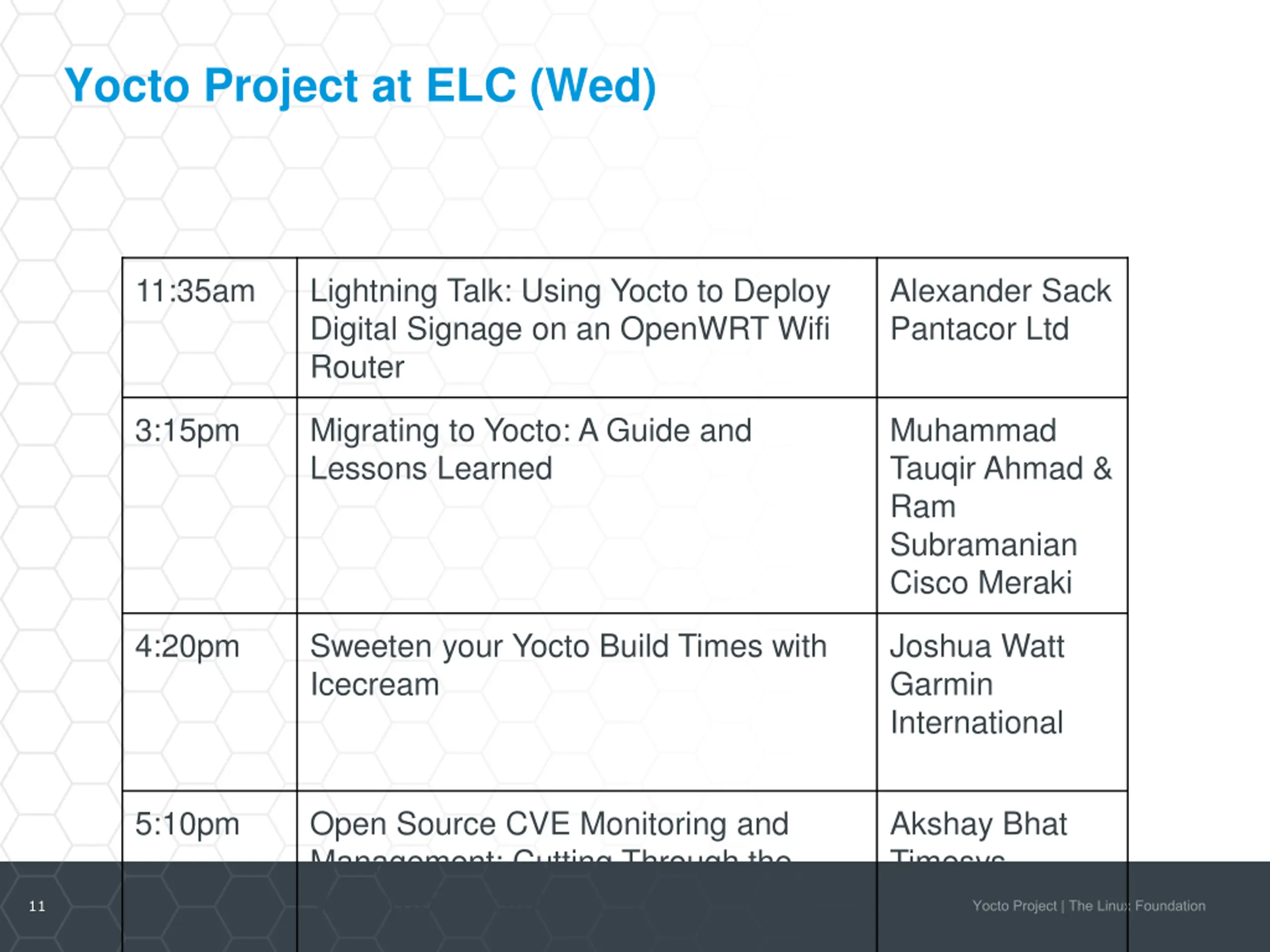 Yocto Project at ELC (Wed) 11:35am Lightning Talk: Using Yocto to Deploy Digital Signage on an OpenWRT Wifi Router Alexander Sack Pantacor Ltd 3:15pm Migrating to Yocto: A Guide and Lessons Learned Muhammad Tauqir Ahmad & Ram Subramanian Cisco Meraki 4:20pm Sweeten your Yocto Build Times with Icecream Joshua Watt Garmin International 5:10pm Open Source CVE Monitoring and Management: Cutting Through the Vulnerability Storm Akshay Bhat Timesys 11