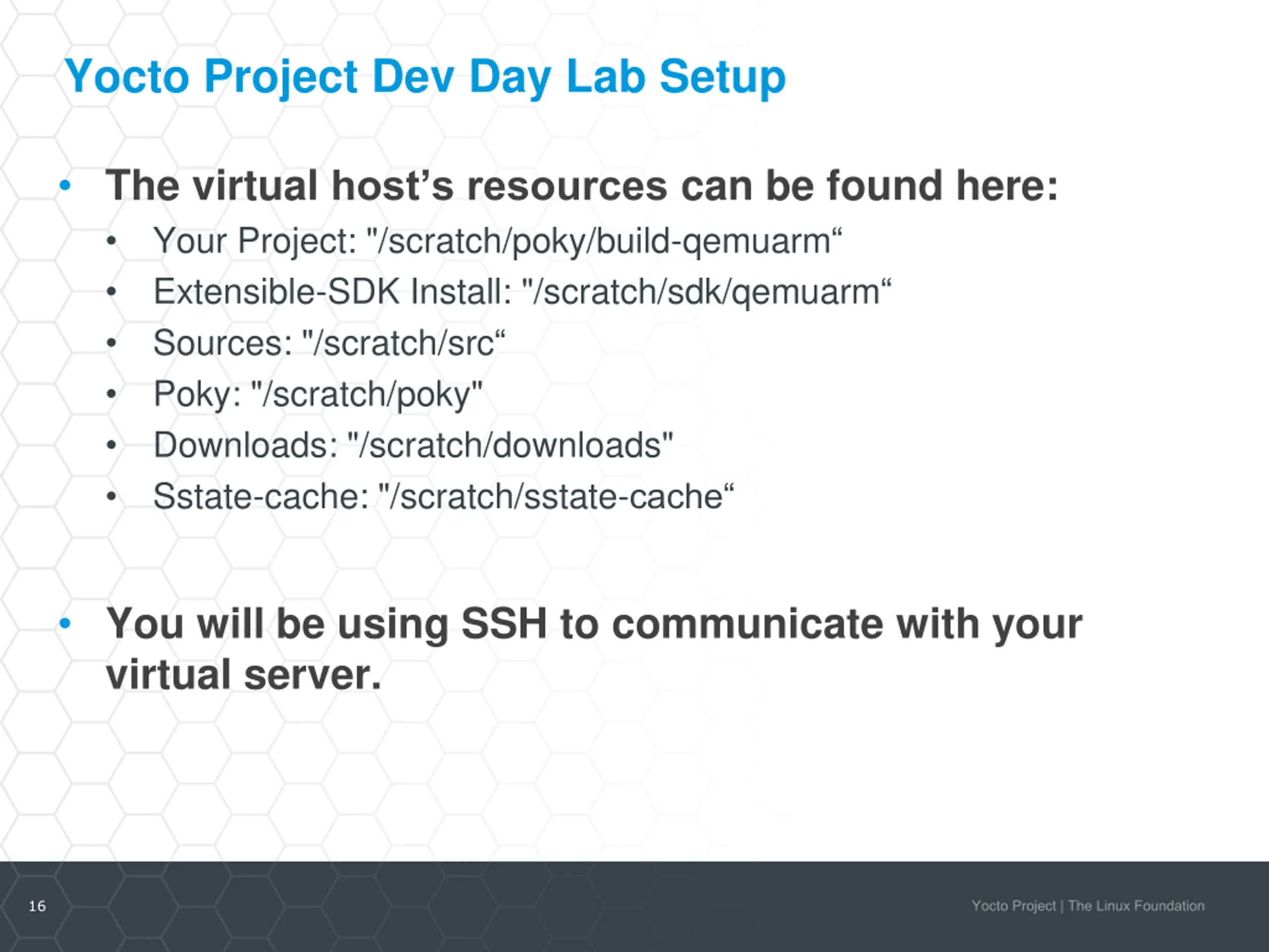 Yocto Project Dev Day Lab Setup The virtual host s resources can be found here: Your Project: "/scratch/poky/build-qemuarm Extensible-SDK Install: "/scratch/sdk/qemuarm Sources: "/scratch/src Poky: "/scratch/poky" Downloads: "/scratch/downloads" Sstate-cache: "/scratch/sstate-cache You will be using SSH to communicate with your virtual server. 16