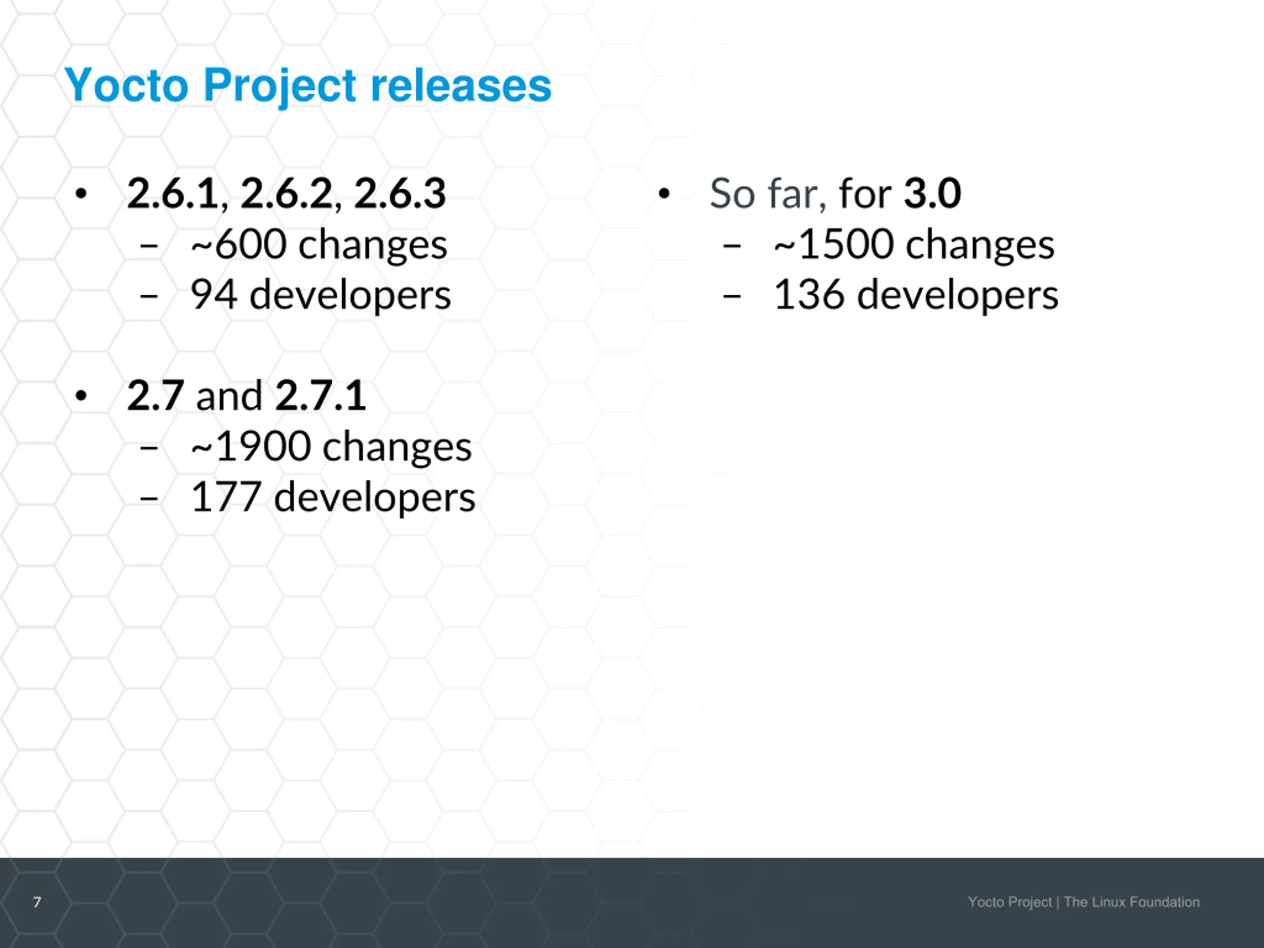 Yocto Project releases 2.6.1, 2.6.2, 2.6.3 ~600 changes 94 developers So far, for 3.0 ~1500 changes 136 developers 2.7 and 2.7.1 ~1900 changes 177 developers 7