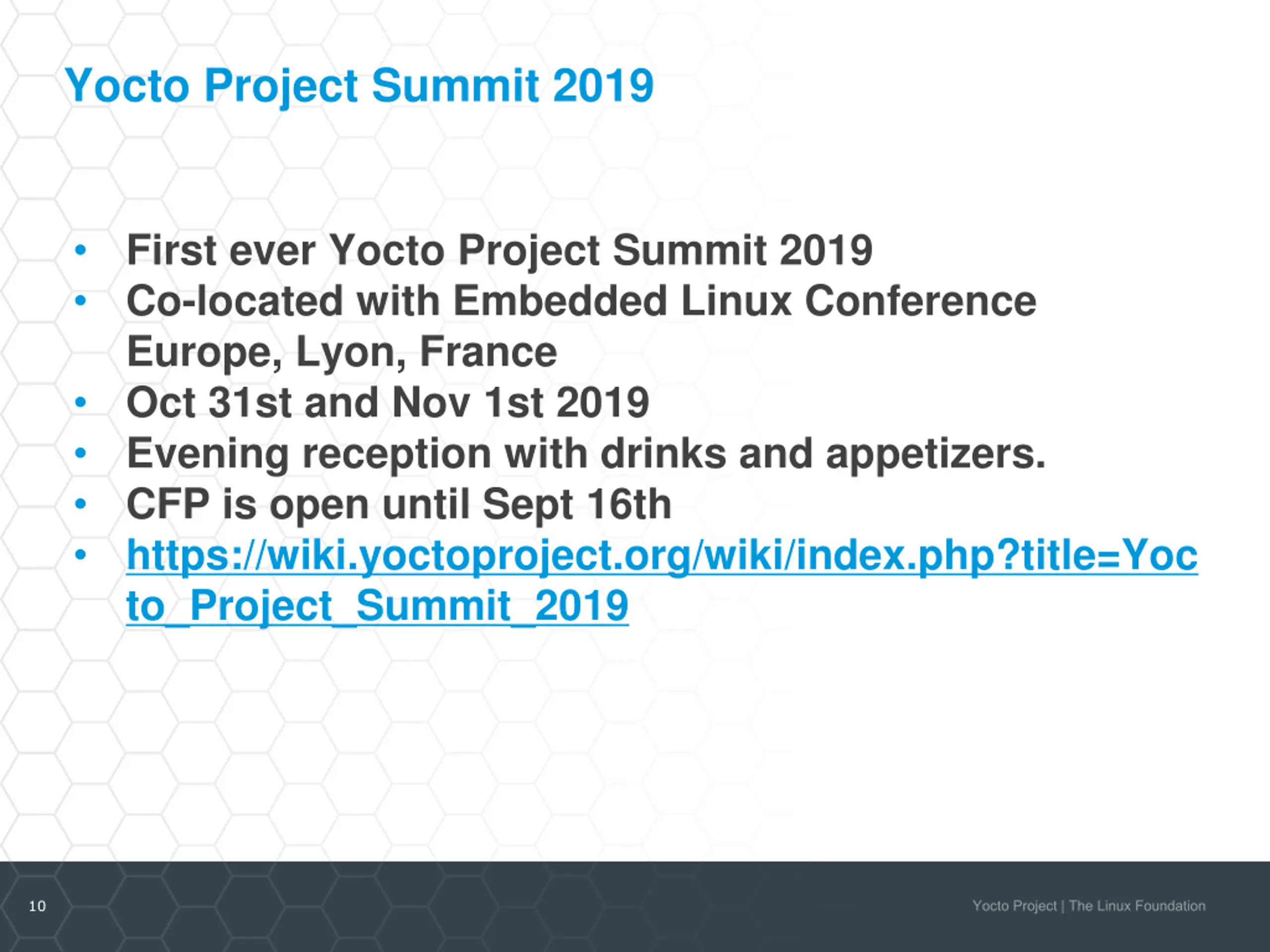 Yocto Project Summit 2019 First ever Yocto Project Summit 2019 Co-located with Embedded Linux Conference Europe, Lyon, France Oct 31st and Nov 1st 2019 Evening reception with drinks and appetizers. CFP is open until Sept 16th https://wiki.yoctoproject.org/wiki/index.php?title=Yoc to_Project_Summit_2019 10