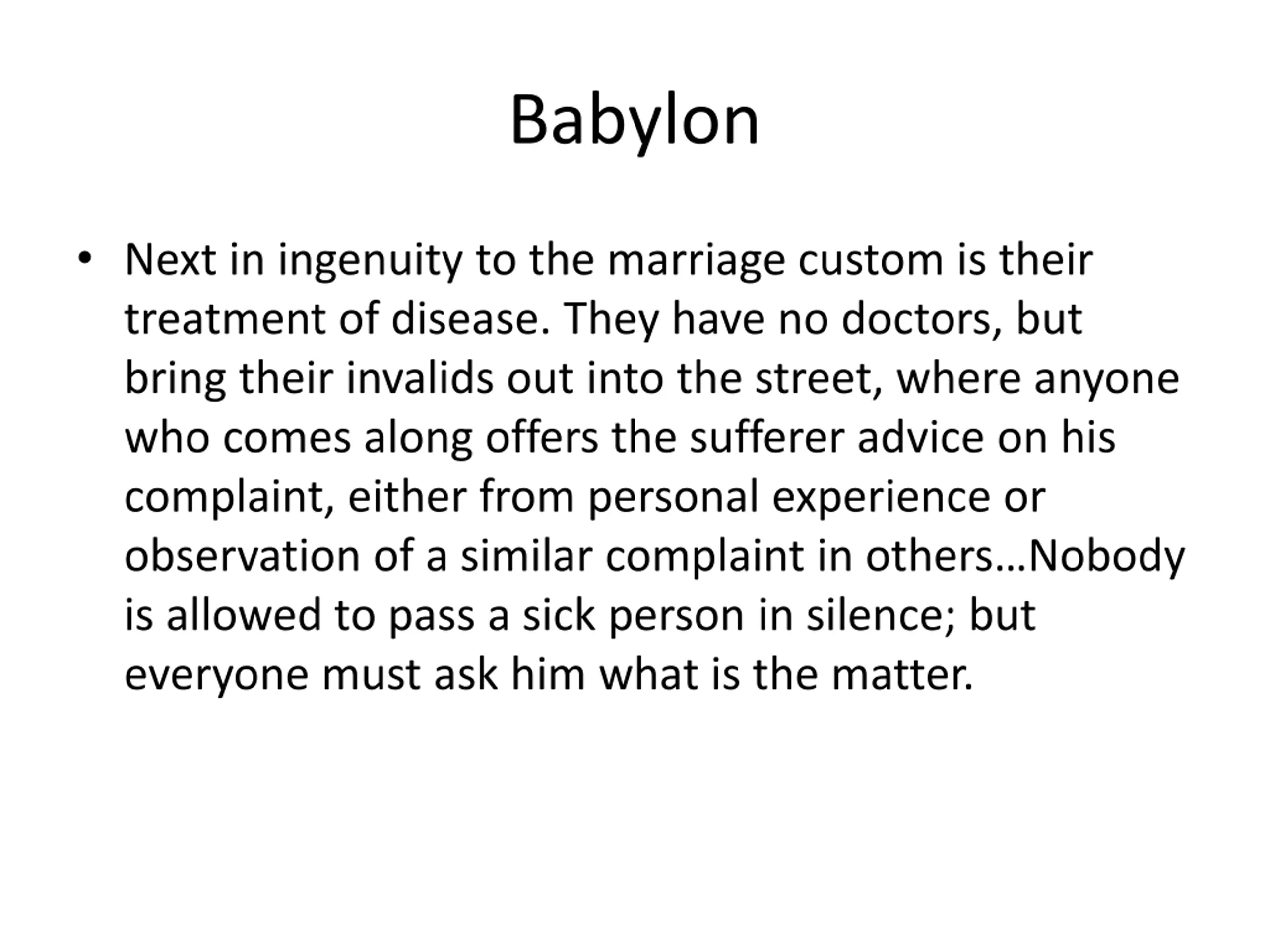 Babylon Next in ingenuity to the marriage custom is their treatment of disease. They have no doctors, but bring their invalids out into the street, where anyone who comes along offers the sufferer advice on his complaint, either from personal experience or observation of a similar complaint in others Nobody is allowed to pass a sick person in silence; but everyone must ask him what is the matter.