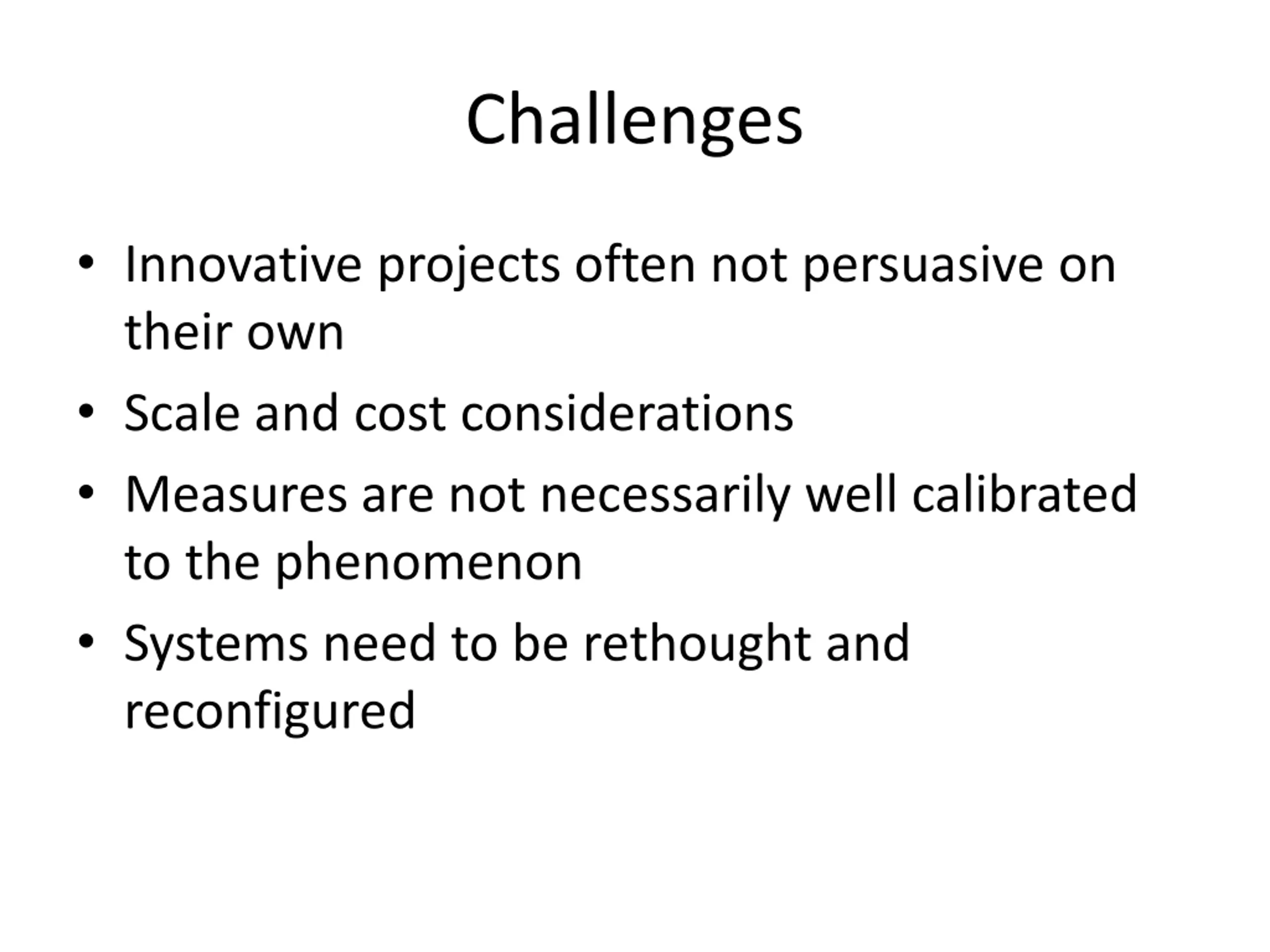 Challenges Innovative projects often not persuasive on their own Scale and cost considerations Measures are not necessarily well calibrated to the phenomenon Systems need to be rethought and reconfigured