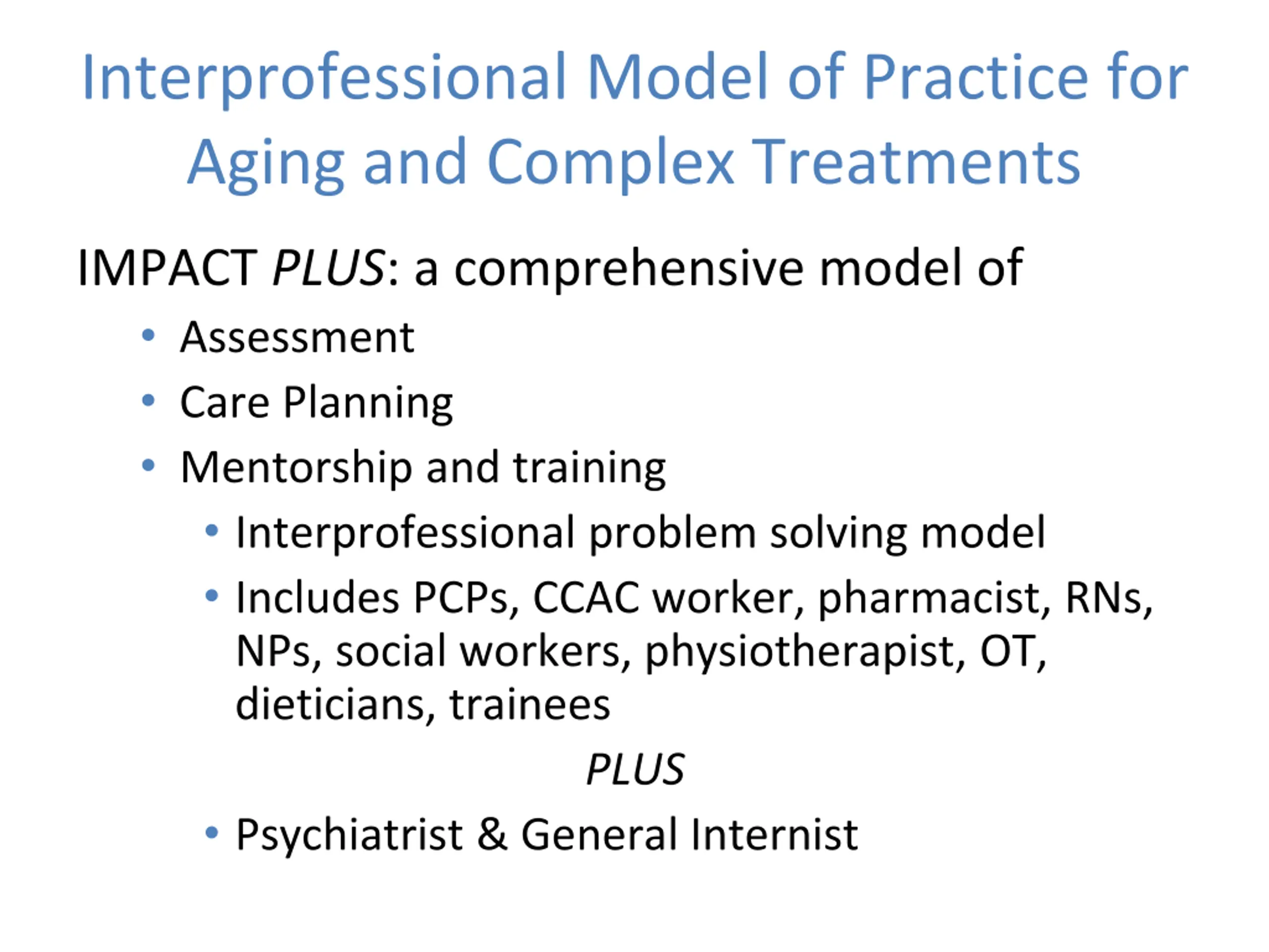 Interprofessional Model of Practice for Aging and Complex Treatments IMPACT PLUS: a comprehensive model of Assessment Care Planning Mentorship and training Interprofessional problem solving model Includes PCPs, CCAC worker, pharmacist, RNs, NPs, social workers, physiotherapist, OT, dieticians, trainees PLUS Psychiatrist & General Internist