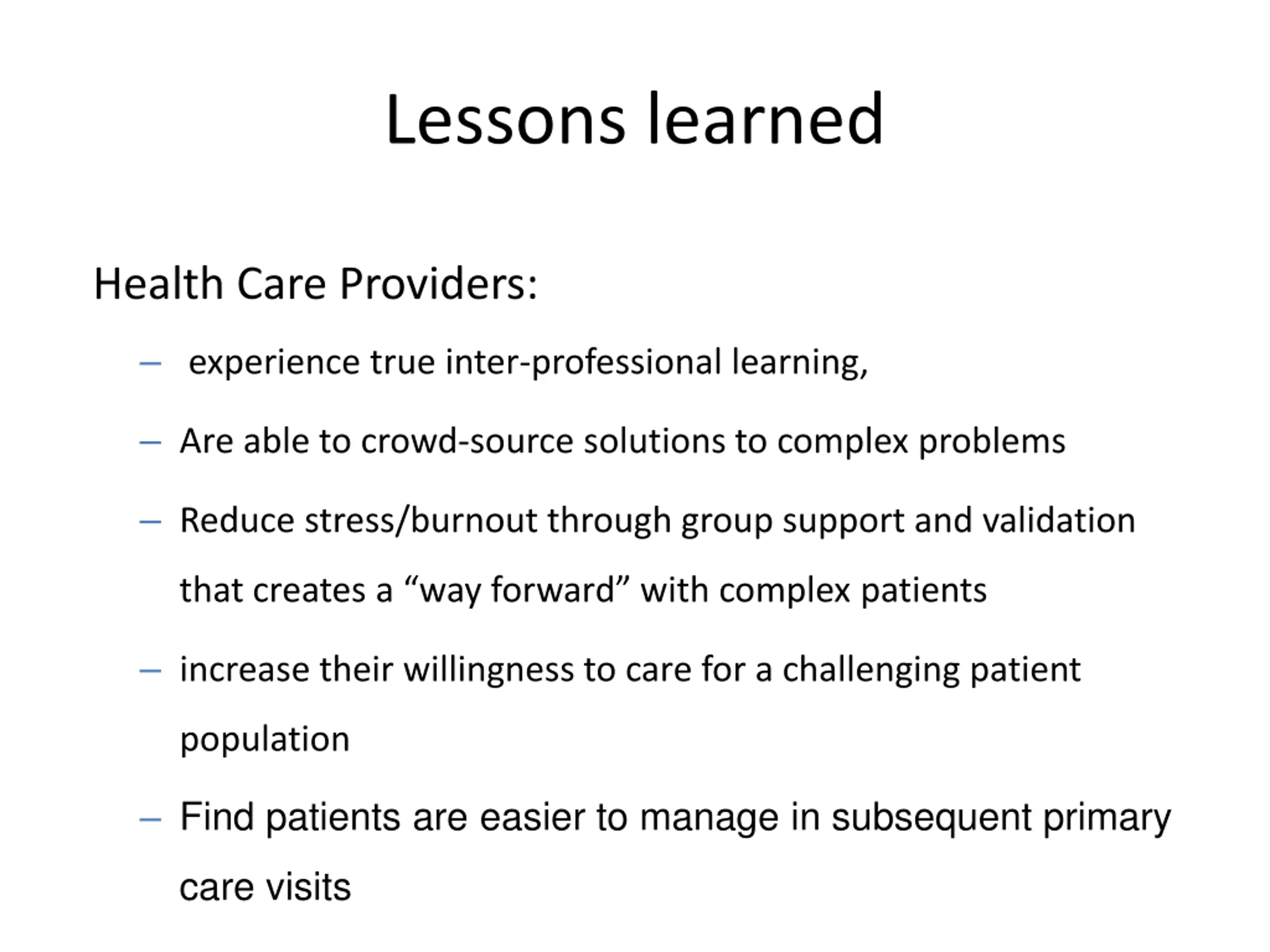 Lessons learned Health Care Providers: experience true inter-professional learning, Are able to crowd-source solutions to complex problems Reduce stress/burnout through group support and validation that creates a way forward with complex patients increase their willingness to care for a challenging patient population Find patients are easier to manage in subsequent primary care visits