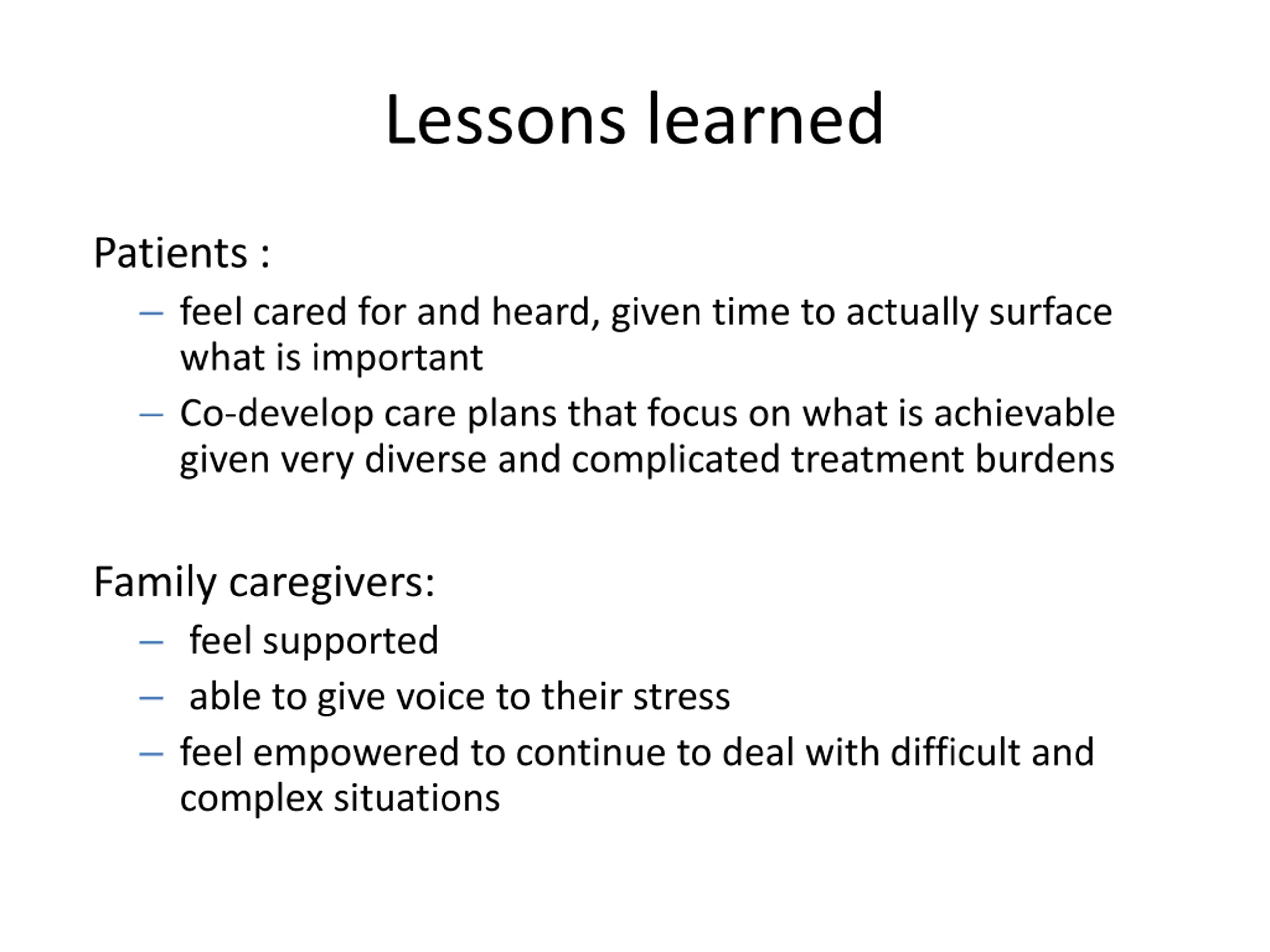 Lessons learned Patients : feel cared for and heard, given time to actually surface what is important Co-develop care plans that focus on what is achievable given very diverse and complicated treatment burdens Family caregivers: feel supported able to give voice to their stress feel empowered to continue to deal with difficult and complex situations
